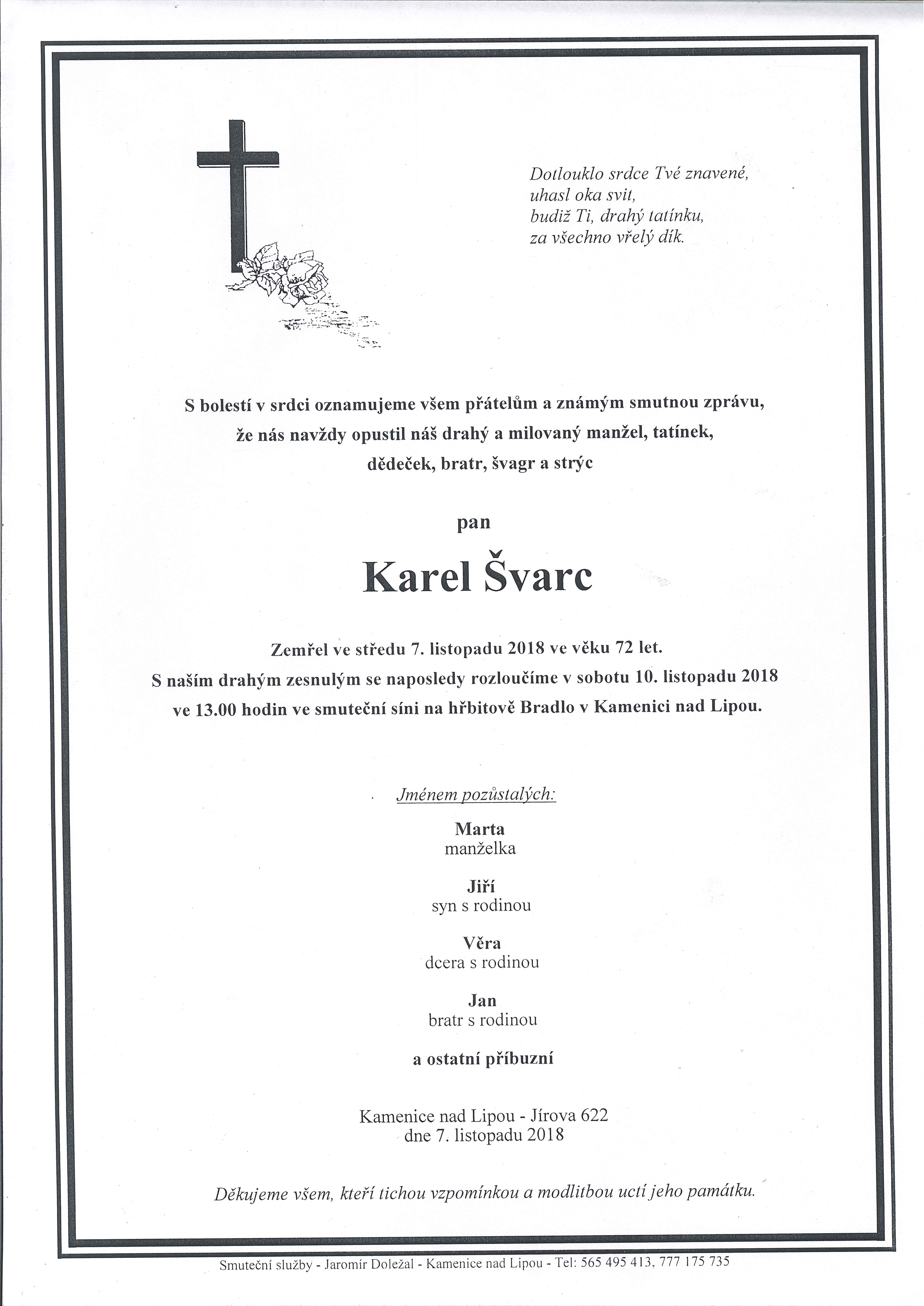 S bolestí v srdci oznamujeme všem příbuzným, přátelům a známým, že nás navždy opustil náš drahý a milovaný pan Karel Švarc. Zemřel ve středu 7. listopadu 2018 ve věku 72 let. S naším drahým zesnulým se naposledy rozloučíme v sobotu 10. listopadu 2018 ve 13.00 hodin ve smuteční síni na hřbitově Bradlo v Kamenici nad Lipou.