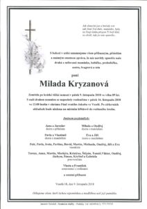 S bolestí v srdci oznamujeme všem přátelům a známým, že nás navždy opustila naše drahá a milovaná paní Milada Kryzanová. Zemřela po krátké těžké nemoci v pátek 9. listopadu 2018 ve věku 89 let. S naší drahou zesnulou se rozloučíme v pátek 16. listopadu 2018 ve 13.00 hodin v kostele svatého Jakuba ve Veselé.