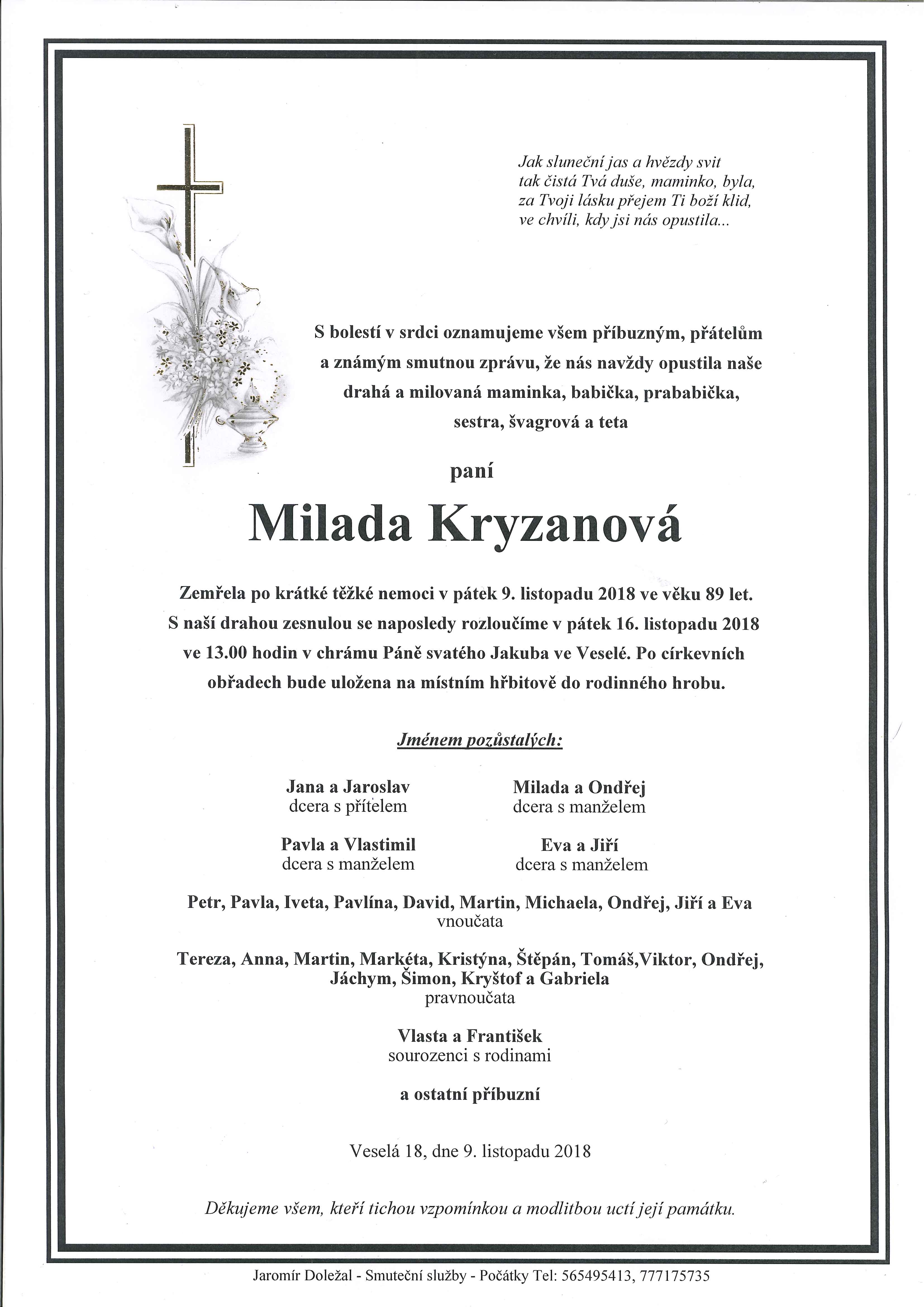 S bolestí v srdci oznamujeme všem přátelům a známým, že nás navždy opustila naše drahá a milovaná paní Milada Kryzanová. Zemřela po krátké těžké nemoci v pátek 9. listopadu 2018 ve věku 89 let. S naší drahou zesnulou se rozloučíme v pátek 16. listopadu 2018 ve 13.00 hodin v kostele svatého Jakuba ve Veselé.