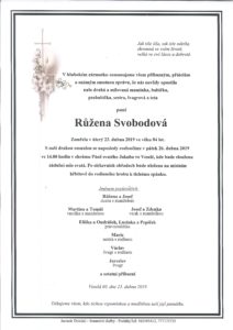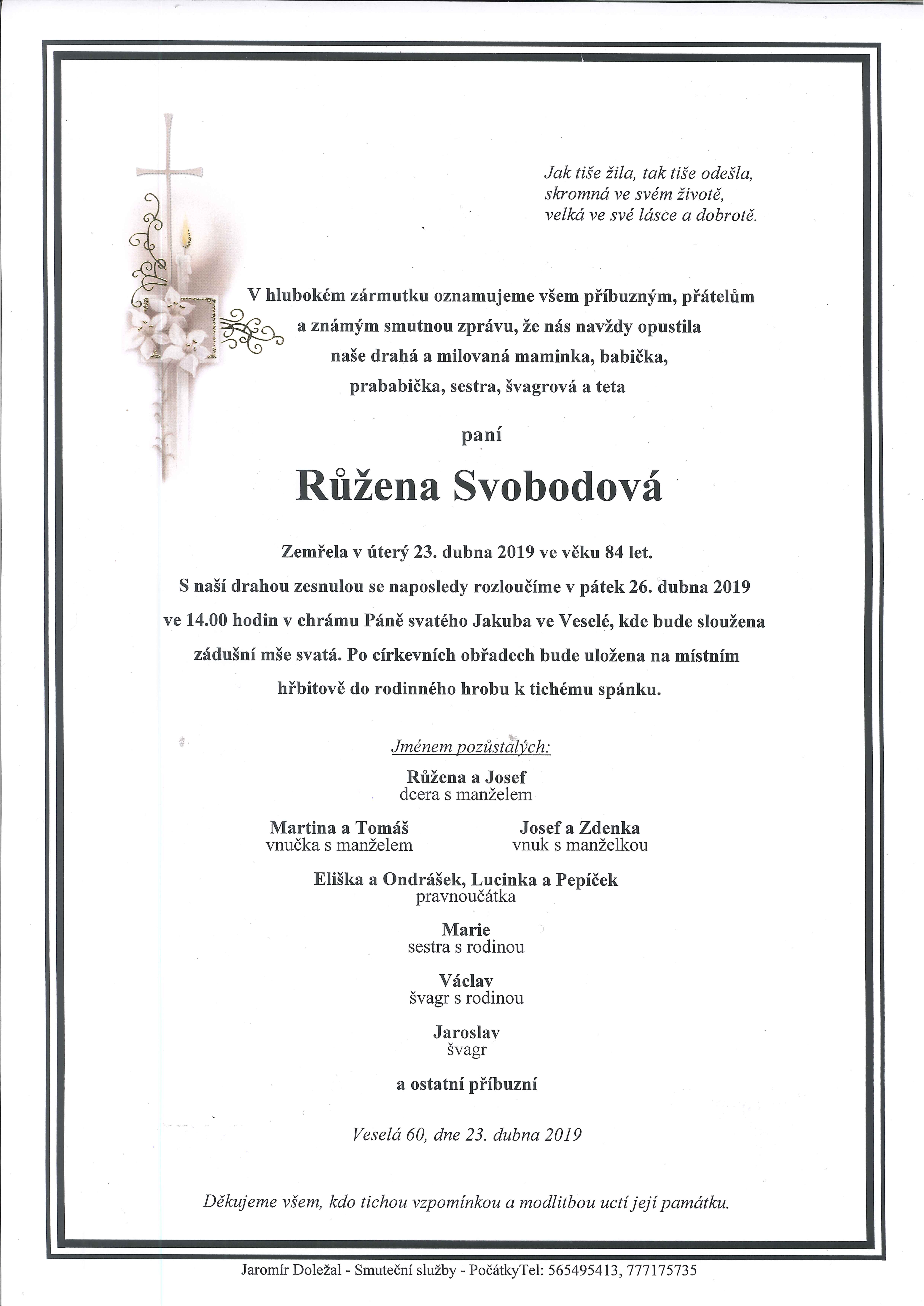 V hlubokém zármutku oznamujeme, že nás opustila drahá a milovaná paní Růžena Svobodová. Zemřela v úterý 23. dubna 2019 ve věku 84 let. S drahou zesnulou se naposledy rozloučíme v pátek 26. dubna 2019 ve 14.00 hodin v chrámu Páně svatého Jakuba ve Veselé.