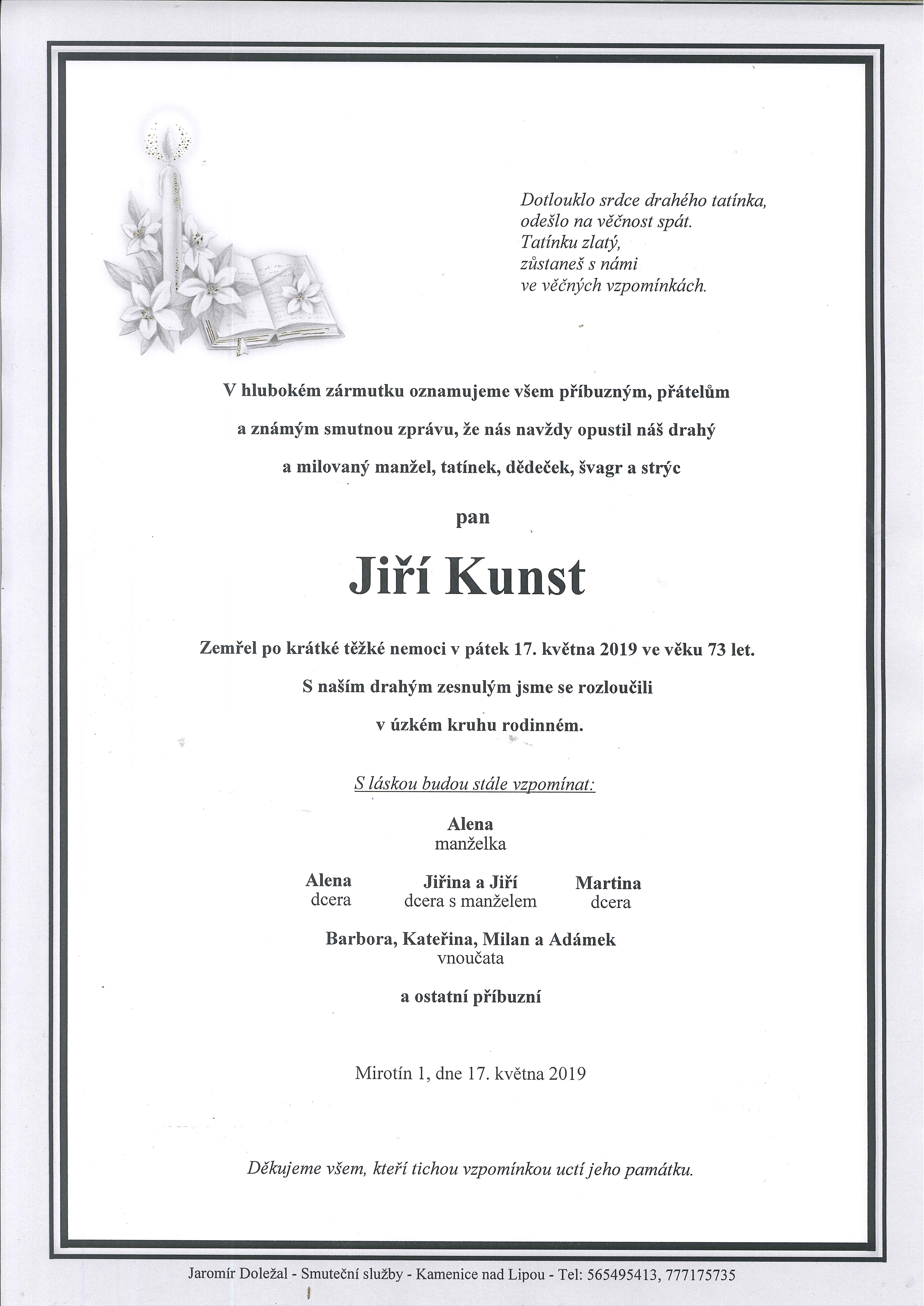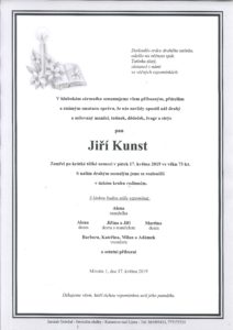 V hlubokém zármutku oznamujeme smutnou zprávu, že nás opustil pan Jiří Kunst. Zemřel po krátké těžké nemoci v pátek 17. května 2019 ve věku 73 let. S drahým zesnulým jsme se rozloučili bez smutečních obřadů.