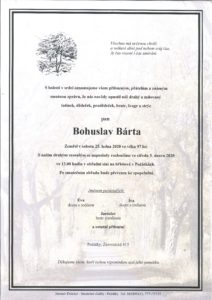 S bolestí v srdci oznamujeme, že nás navždy opustil pan Bohuslav Bárta. Zemřel v sobotu 25. ledna 2020 ve věku 97 let. S drahým zesnulým se naposledy rozloučíme ve středu 5. února 2020 ve 13.00 hodin v obřadní síni na hřbitově v Počátkách.