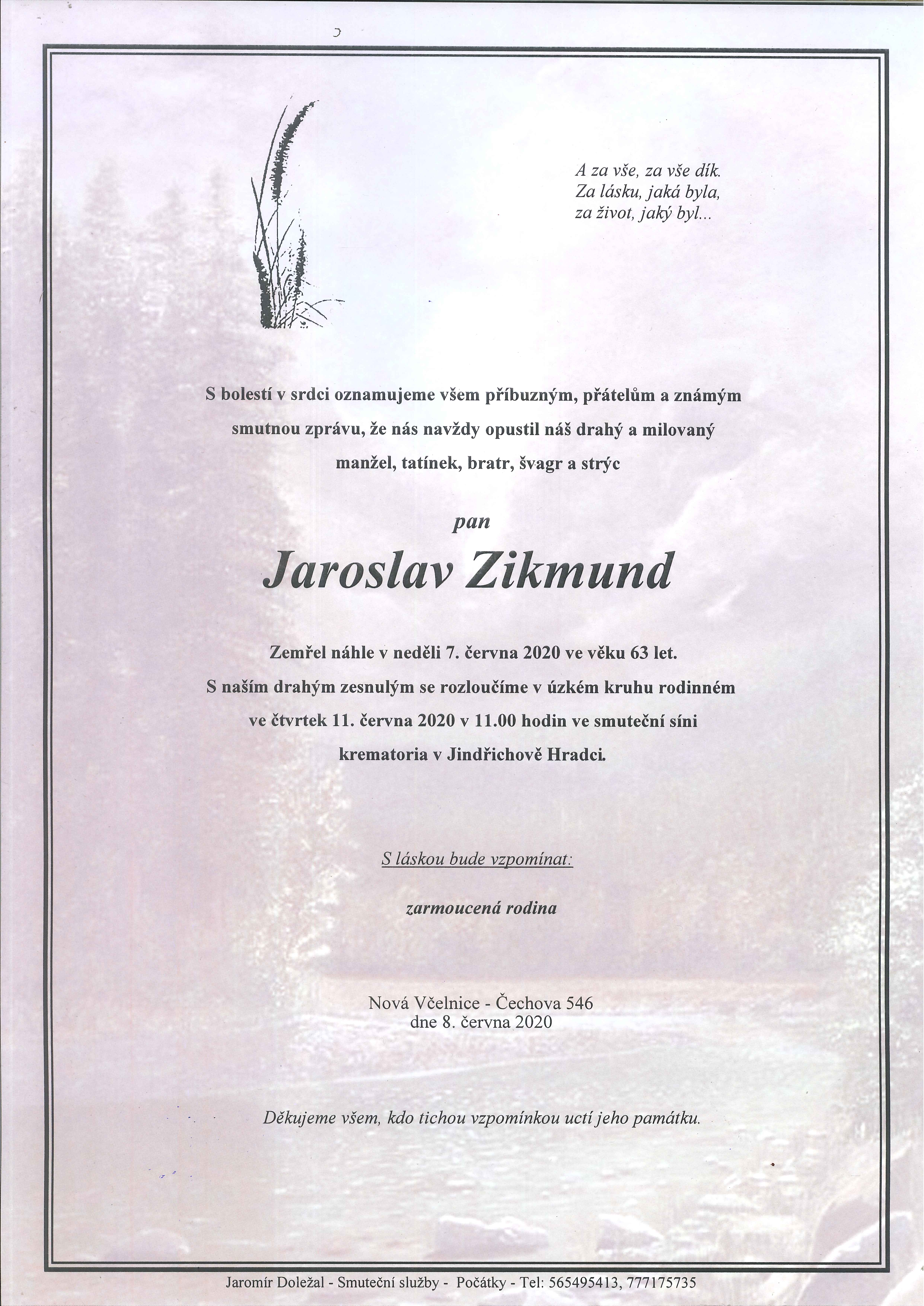 S bolestí v srdci oznamujeme, že nás opustil pan Jaroslav Zikmund. Zemřel náhle v neděli 7. června 2020 ve věku 63 let. S drahým zesnulým se naposledy rozloučíme v úzkém kruhu rodinném ve čtvrtek 11. června 2020 v 11.00 hodin ve smuteční síni krematoria v Jindřichově Hradci.