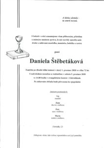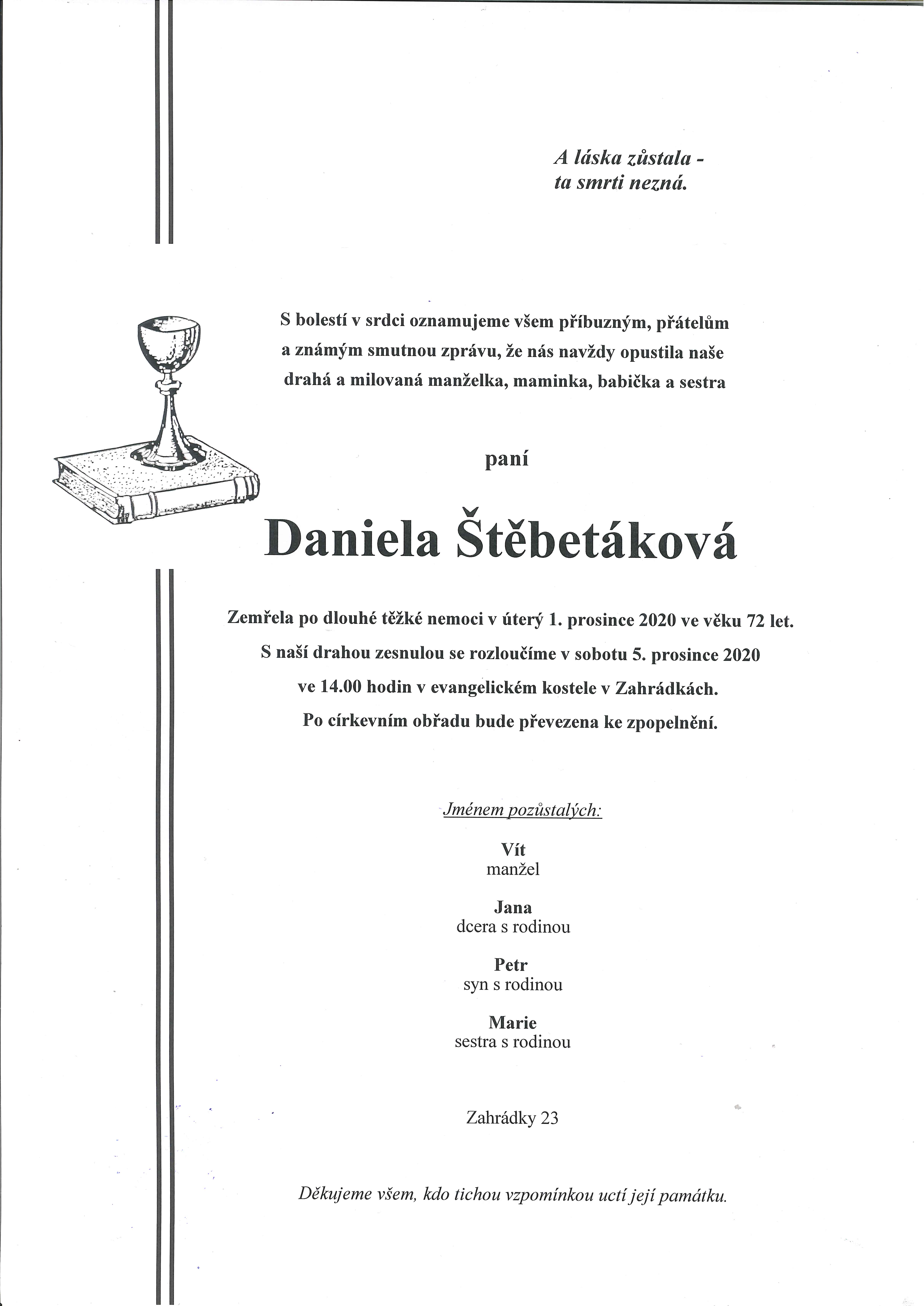 S bolestí v srdci oznamujeme, že nás opustila paní Daniela Štěbetáková. Zemřela po dlouhé těžké nemoci v úterý 1. prosince 2020 ve věku 72 let. S drahou zesnulou se rozloučíme v sobotu 5. prosince 2020 ve 14.00 hodin v evangelickém kostele v Zahrádkách.
