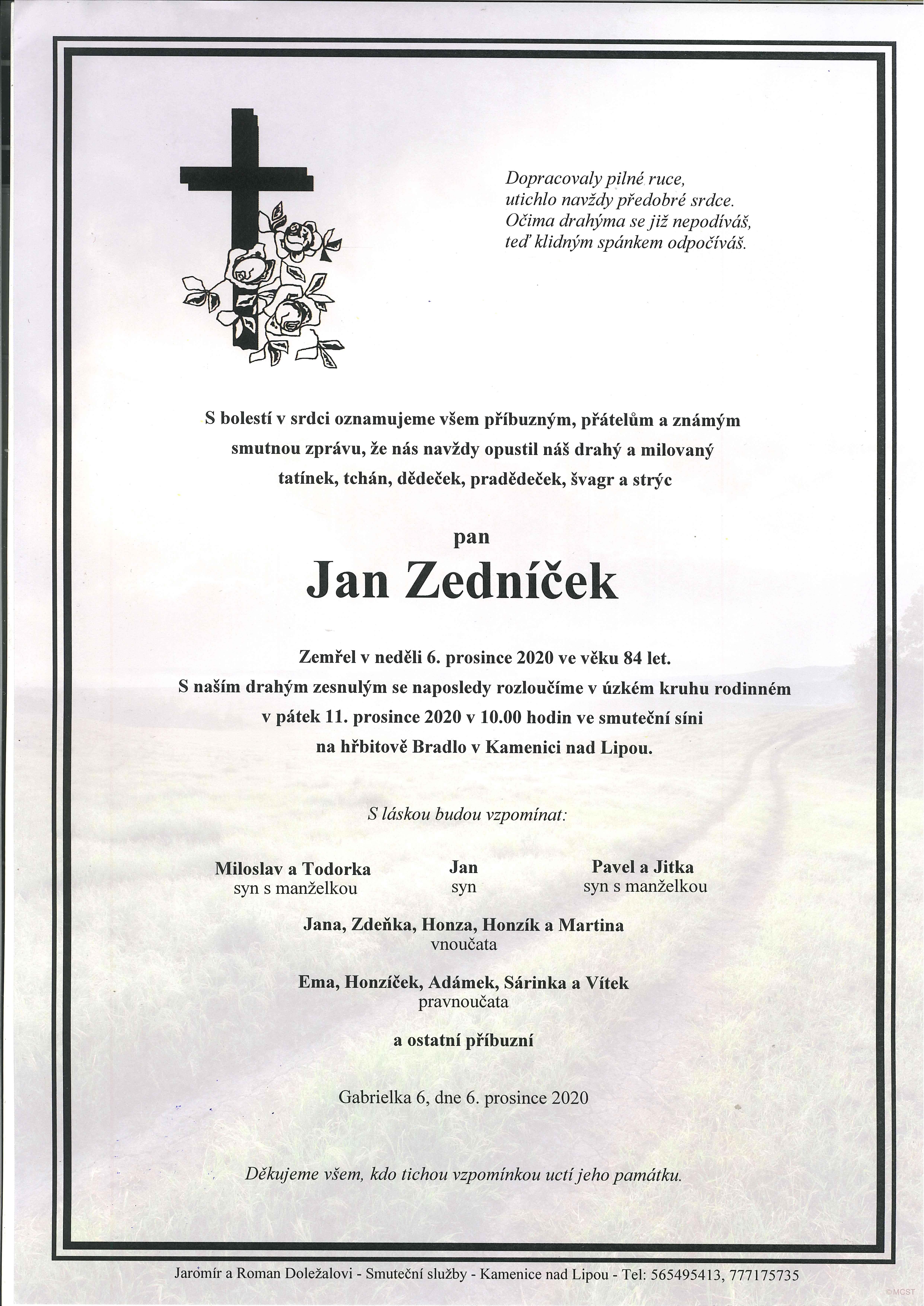 S bolestí v srdci oznamujeme že nás opustil pan Jan Zedníček. Zemřel v neděli 6. prosince 2020 ve věku 84 let. S drahým zesnulým se naposledy rozloučíme v úzkém kruhu rodinném v pátek 11. prosince 2020 v 10.00 hodin ve smuteční síni na hřbitově Bradlo v Kamenici nad Lipou.