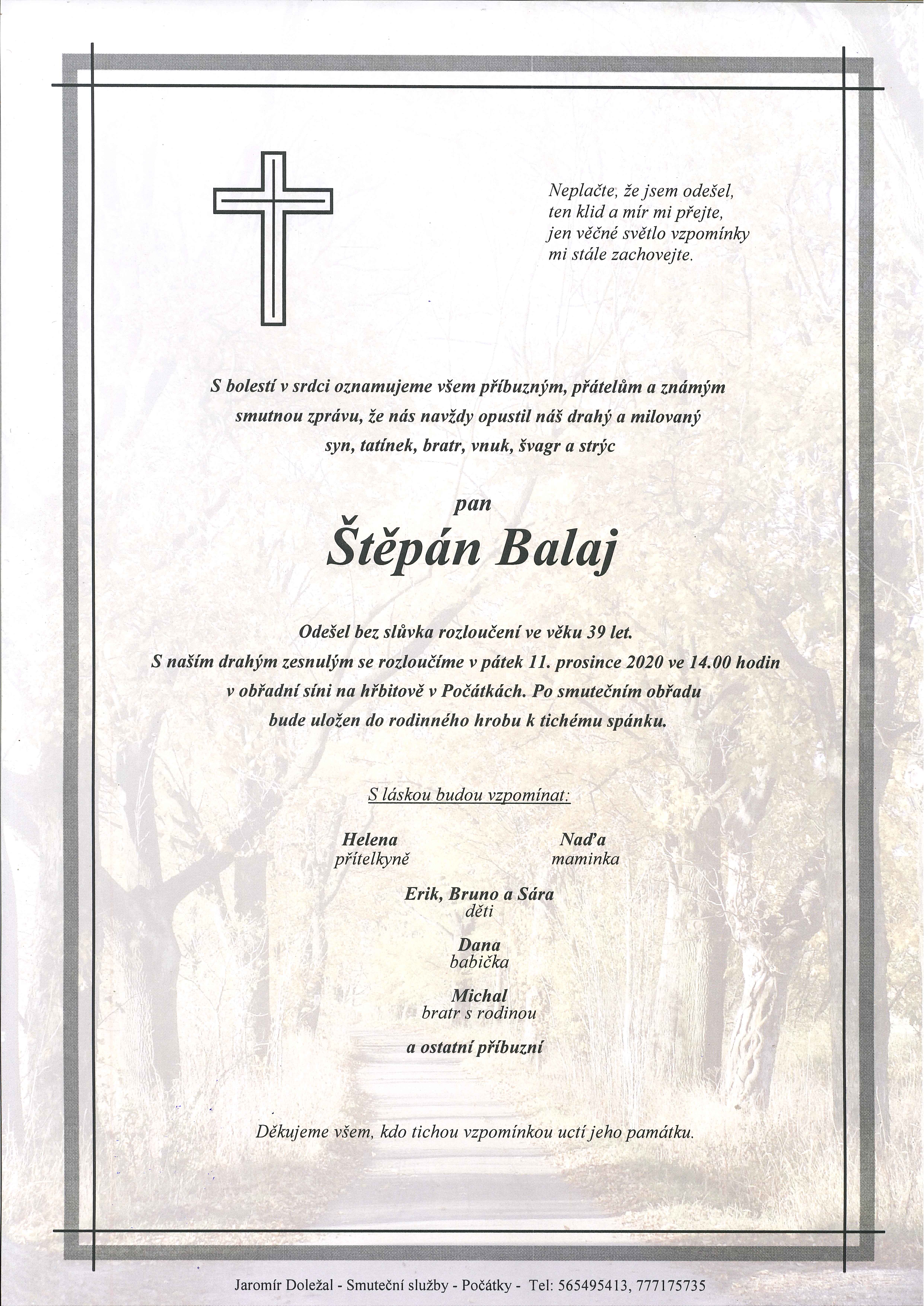 S bolestí v srdci oznamujeme, že nás opustil pan Štěpán Balaj. Odešel bez slůvka rozloučení ve věku 39 let. S drahým zesnulým se naposledy rozloučíme v pátek 11. prosince 2020 ve 14.00 hodin v obřadní na hřbitově v Počátkách.