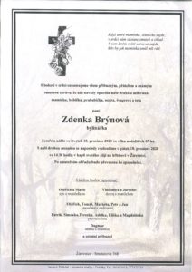 S bolestí v srdci oznamujeme, že nás opustila paní Zdenka Brýnová. Zemřela náhle ve čtvrtek 10. prosince 2020 ve věku nedožitých 85 let. S drahou zesnulou se naposledy rozloučíme v pátek 18. prosince 2020 ve 14.30 hodin v kapli svatého Jiljí na hřbitově v Žirovnici.