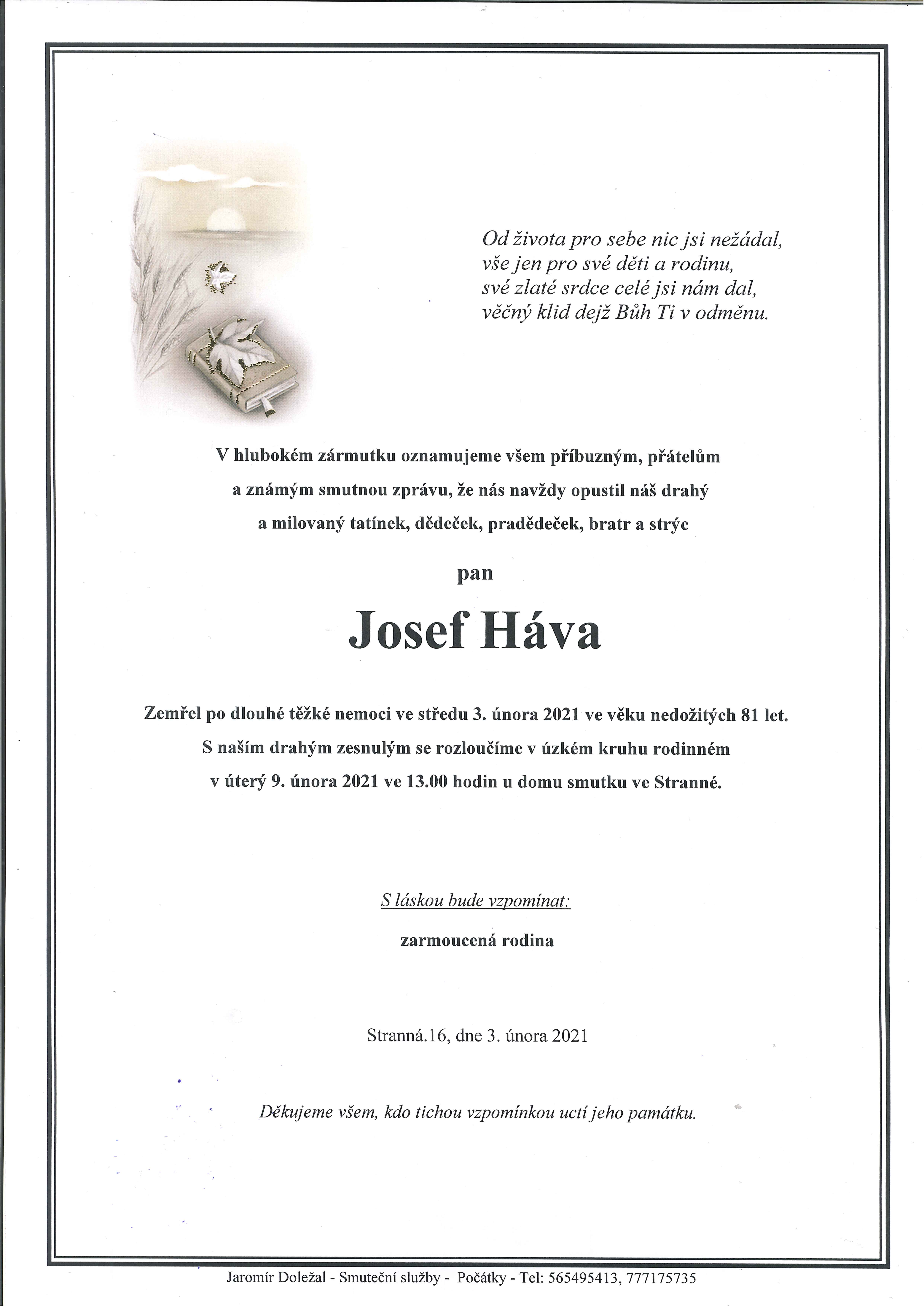 V hlubokém zármutku oznamujeme, že nás opustil pan Josef Háva. Zemřel po dlouhé těžké nemoci ve středu 3. února 2021 ve věku nedožitých 81 let. S drahým zesnulým se rozloučíme v úzkém kruhu rodinném
