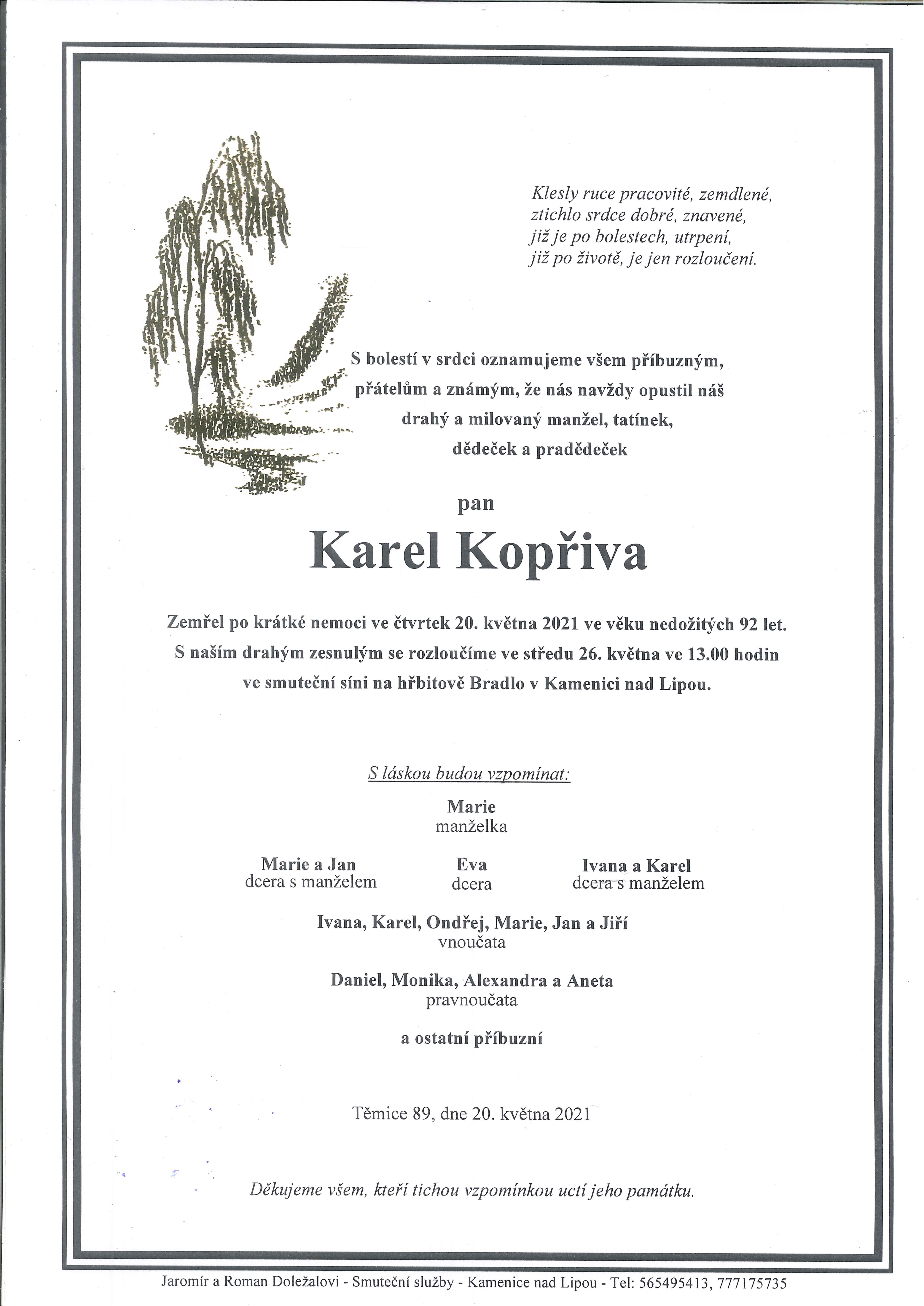 S bolestí v srdci oznamujeme, že nás navždy opustil pan Karel Kopřiva. Zemřel po krátké nemoci ve čtvrtek 20. května 2021 ve věku nedožitých 92 let. S drahým zesnulým se rozloučíme ve středu 26. května 2021 ve 13.00 hodin ve smuteční síni na hřbitově Bradlo v Kamenici nad Lipou.