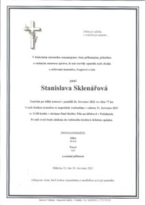V hlubokém zármutku oznamujeme, že nás opustila paní Stanislava Sklenářová. Zemřela po těžké nemoci v pondělí 26. července ve věku 77 let. S drahou zesnulou se naposledy rozloučíme v sobotu 31. července 2021 ve 13.00 hodin v chrámu Páně Božího Těla na hřbitově v Počátkách.