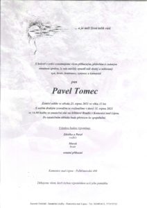 S bolestí v srdci oznamujeme, že nás opustil pan Pavel Tomec. Zemřel náhle ve středu 25. srpna 2021 ve věku 32 let. S drahým zesnulým se rozloučíme v úterý 31. srpna 2021 ve 14.00 hodin ve smuteční síni na hřbitově Bradlo v Kamenici nad Lipou.
