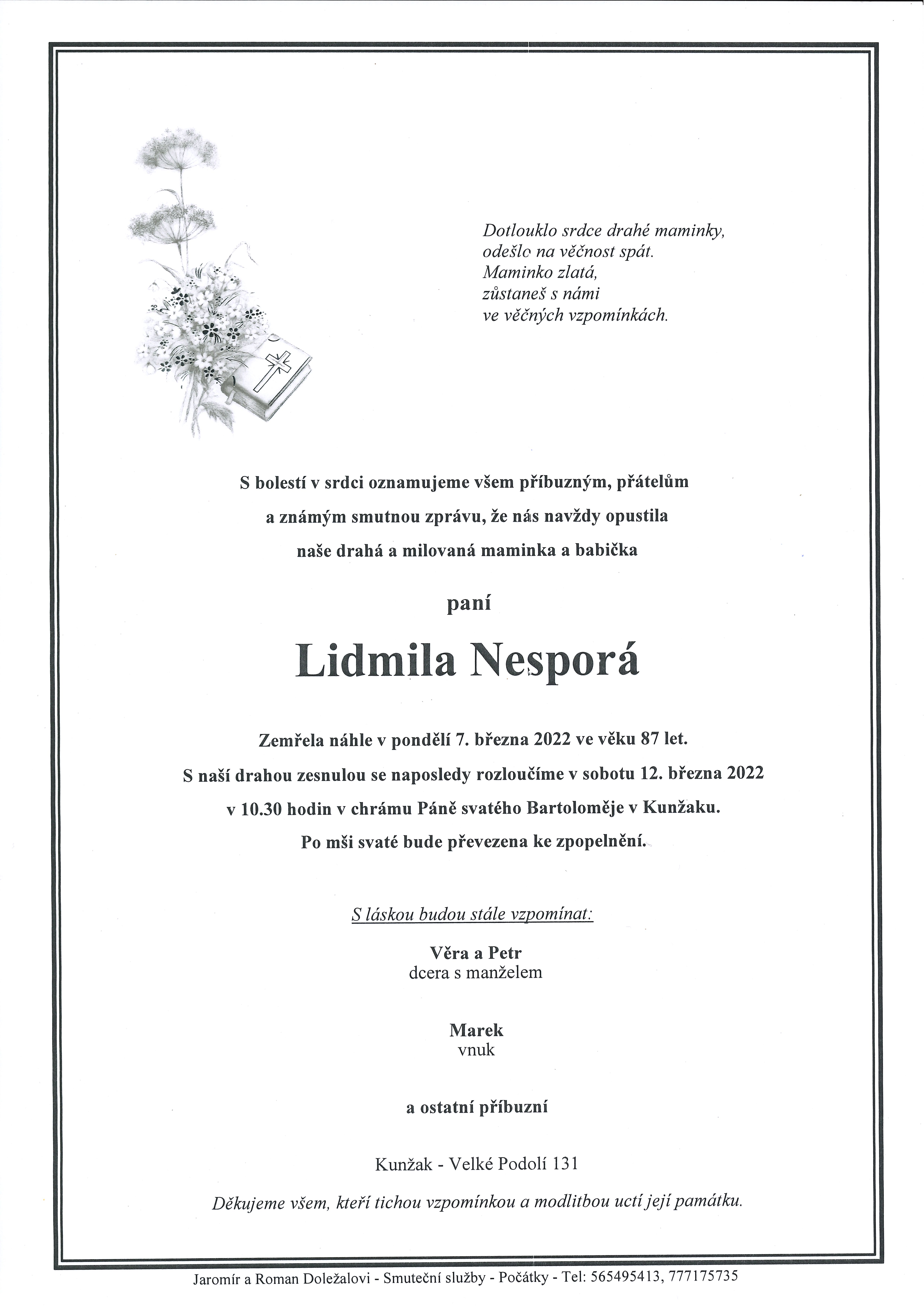S bolestí v srdci oznamujeme, že nás opustila paní Lidmila Nesporá. Zemřela náhle v pondělí 7. března 2022 ve věku 87 let. S drahou zesnulou se naposledy rozloučíme v sobotu 12. března 2022 v 10.30 hodin v chrámu Páně svatého Bartoloměje v Kunžaku.