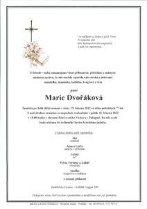 S bolestí v srdci oznamujeme, že nás opustila paní Marie Dvořáková. Zemřela po delší těžké nemoci v úterý 15. března 2022 ve věku nedožitých 77 let. S drahou zesnulou se naposledy rozloučíme v pátek 18. března 2022 v 15.00 hodin v chrámu Páně svatého Václava v Palupíně.