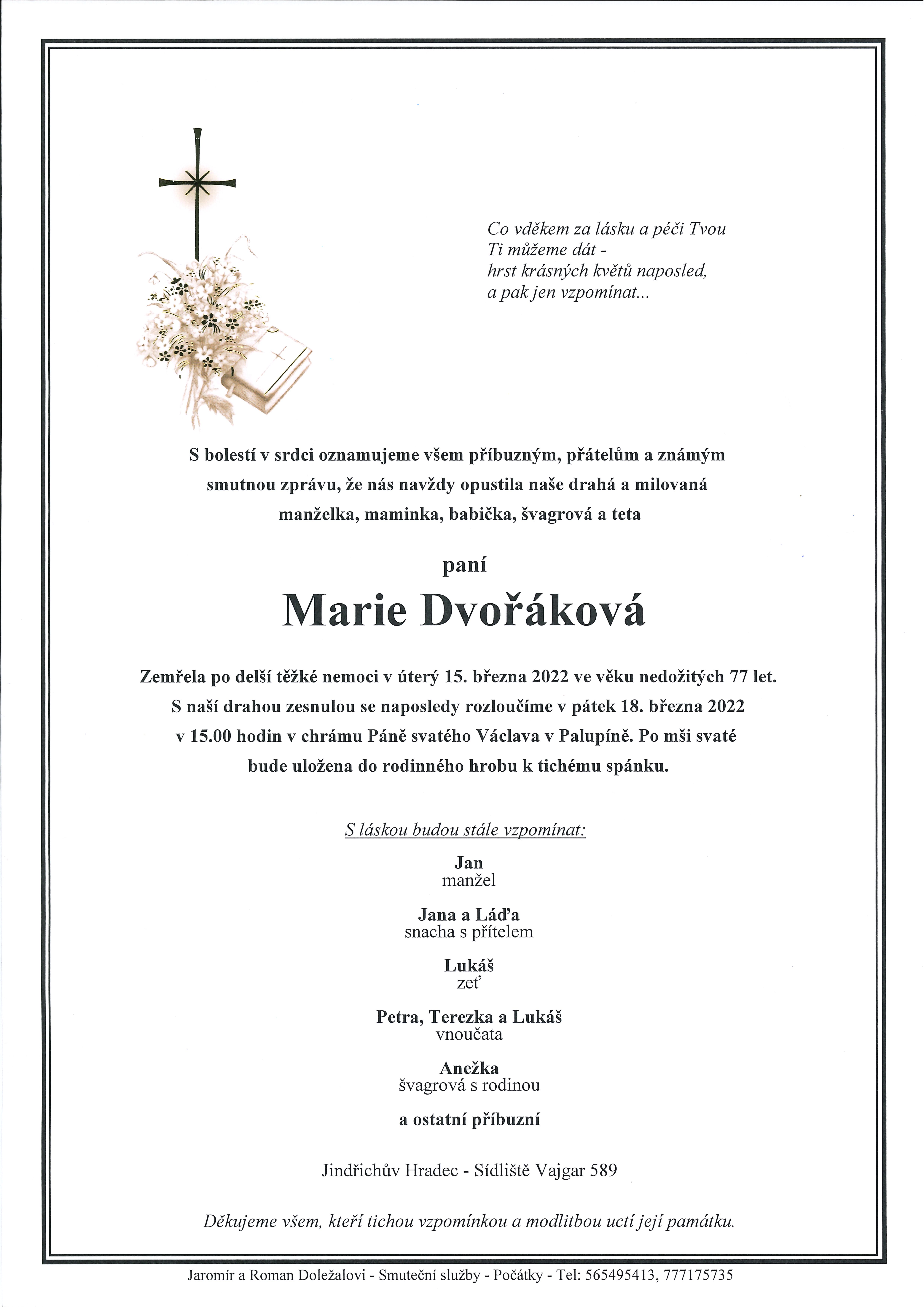 S bolestí v srdci oznamujeme, že nás opustila paní Marie Dvořáková. Zemřela po delší těžké nemoci v úterý 15. března 2022 ve věku nedožitých 77 let. S drahou zesnulou se naposledy rozloučíme v pátek 18. března 2022 v 15.00 hodin v chrámu Páně svatého Václava v Palupíně.