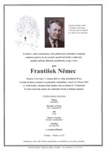 S bolestí v srdci oznamujeme, že nás opustil pan František Němec. Zemřel ve čtvrtek 17. března 2022 ve věku nedožitých 90 let. S drahým zesnulým se naposledy rozloučíme v úterý 22. března 2022 ve 14.00 hodin v chrámu Páně Božího Těla na hřbitově v Počátkách.