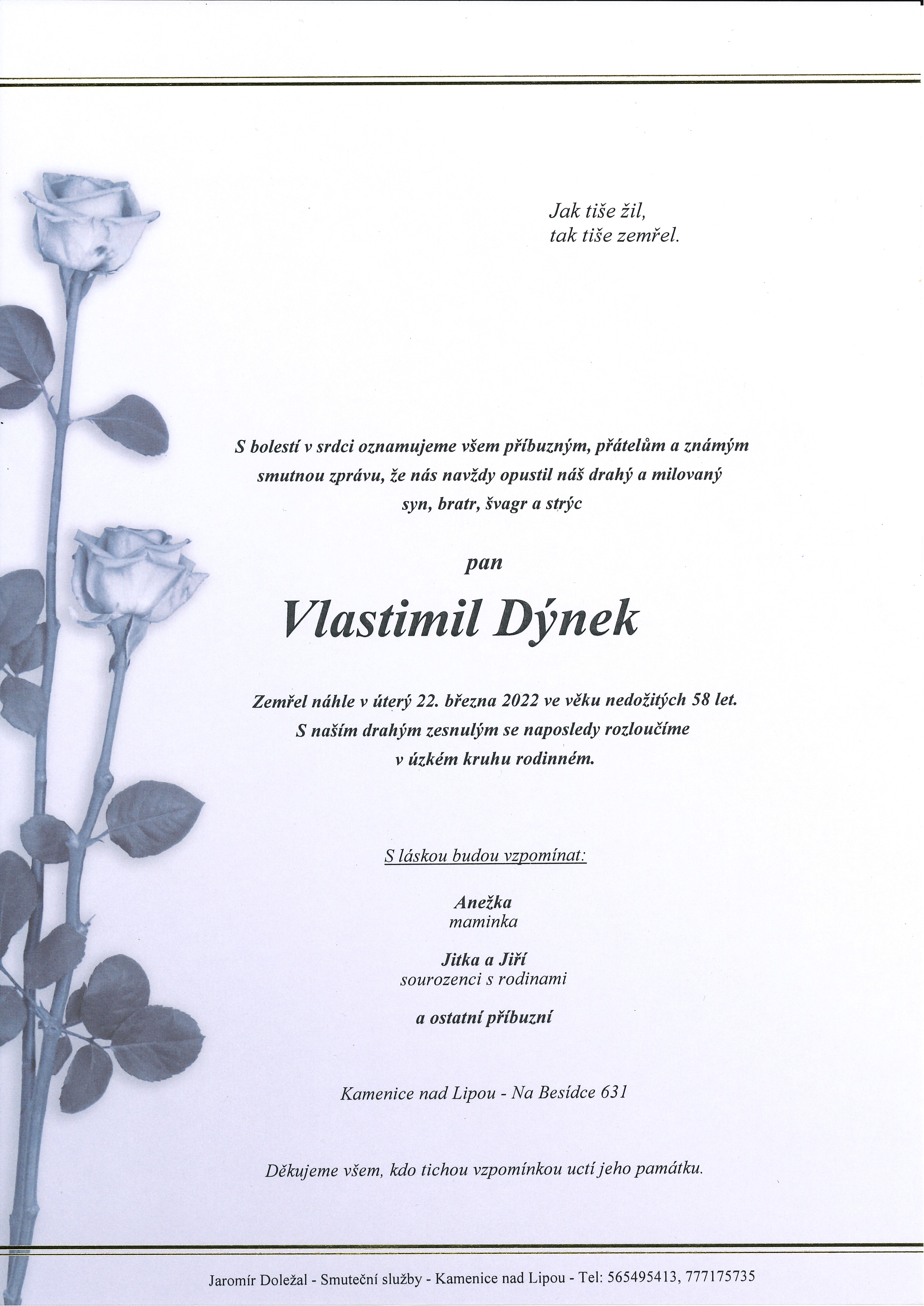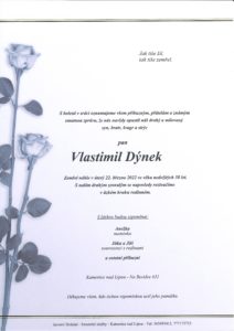 S bolestí v srdci oznamujeme, že nás opustil pan Vlastimil Dýnek. Zemřel náhle v úterý 22. března 2022 ve věku nedožitých 58 let. S drahým zesnulým se naposledy rozloučíme v úzkém kruhu rodinném.