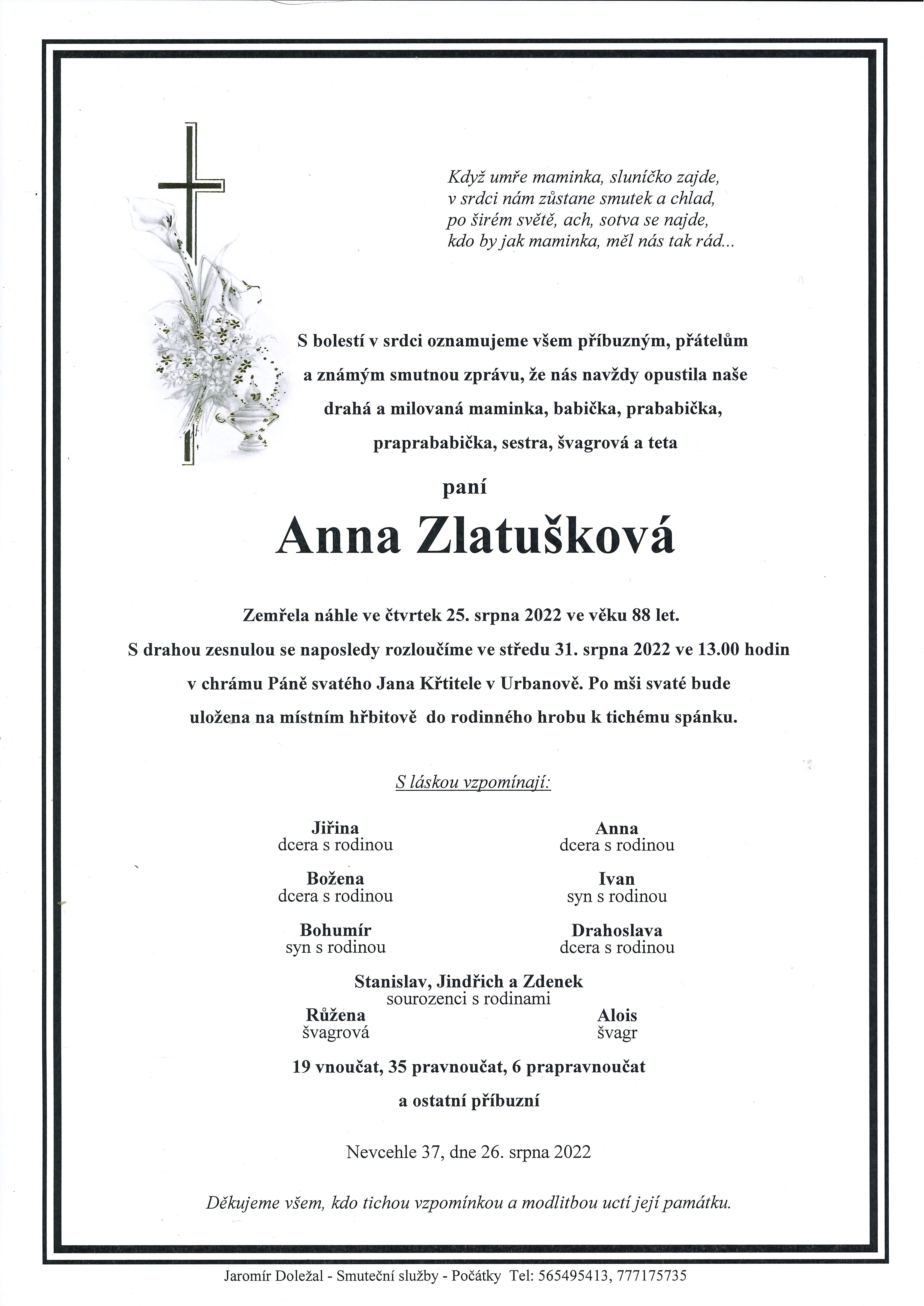 S bolestí v srdci oznamujeme, že nás opustila paní Anna Zlatušková. Zemřela náhle ve čtvrtek 25. srpna 2022 ve věku 88 let. S drahou zesnulou se naposledy rozloučíme ve středu 31. srpna 2022 ve 13.00 hodin v chrámu Páně svatého Jan Křtitele v Urbanově. Po mši svaté bude uložena na místním hřbitově do rodinného hrobu.