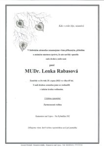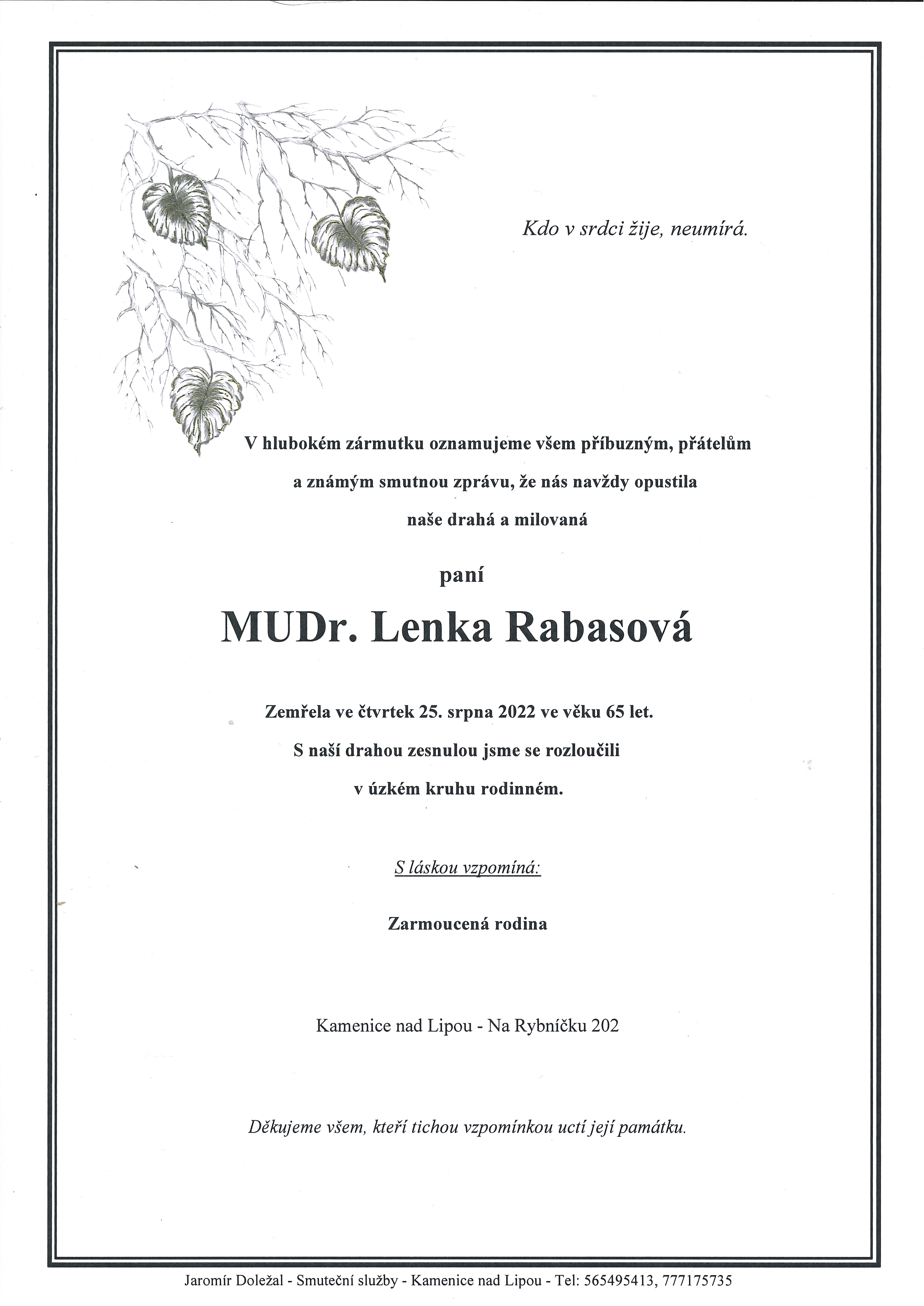 V hlubokém zármutku oznamujeme, že nás opustila paní MUDr. Lenka Rabasová. Zemřela ve čtvrtek 25. srpna 2022 ve věku 65 let. S drahou zesnulou jsme se rozloučili v úzkém kruhu rodinném.
