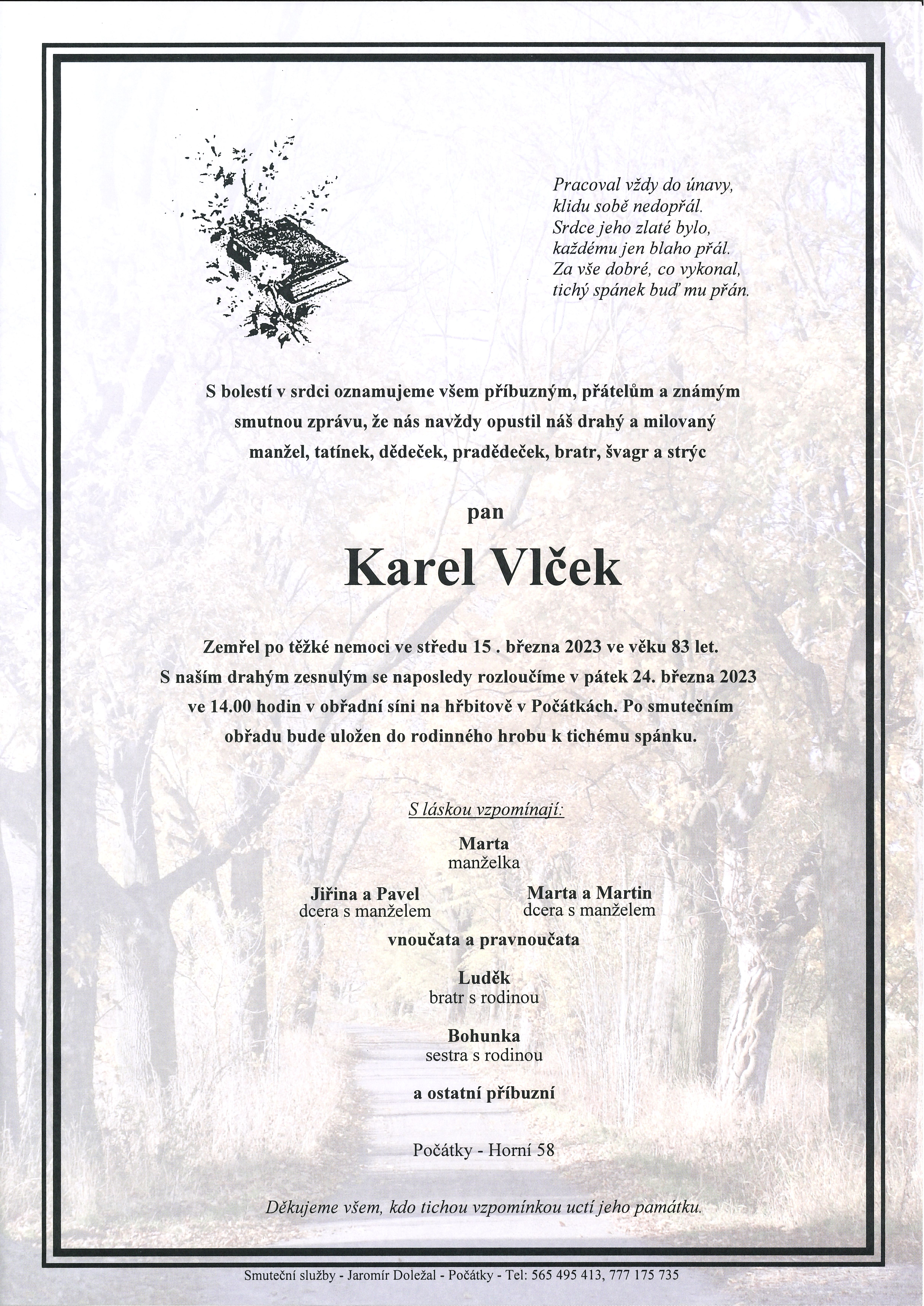 S bolestí v srdci oznamujeme, že nás opustil pan Karel Vlček. Zemřel po těžké nemoci ve středu 15. března 2023 ve věku 83 let. S drahým zesnulým se naposledy rozloučíme v pátek 24. března 2023 ve 14.00 hodin v obřadní síni na hřbitově v Počátkách.