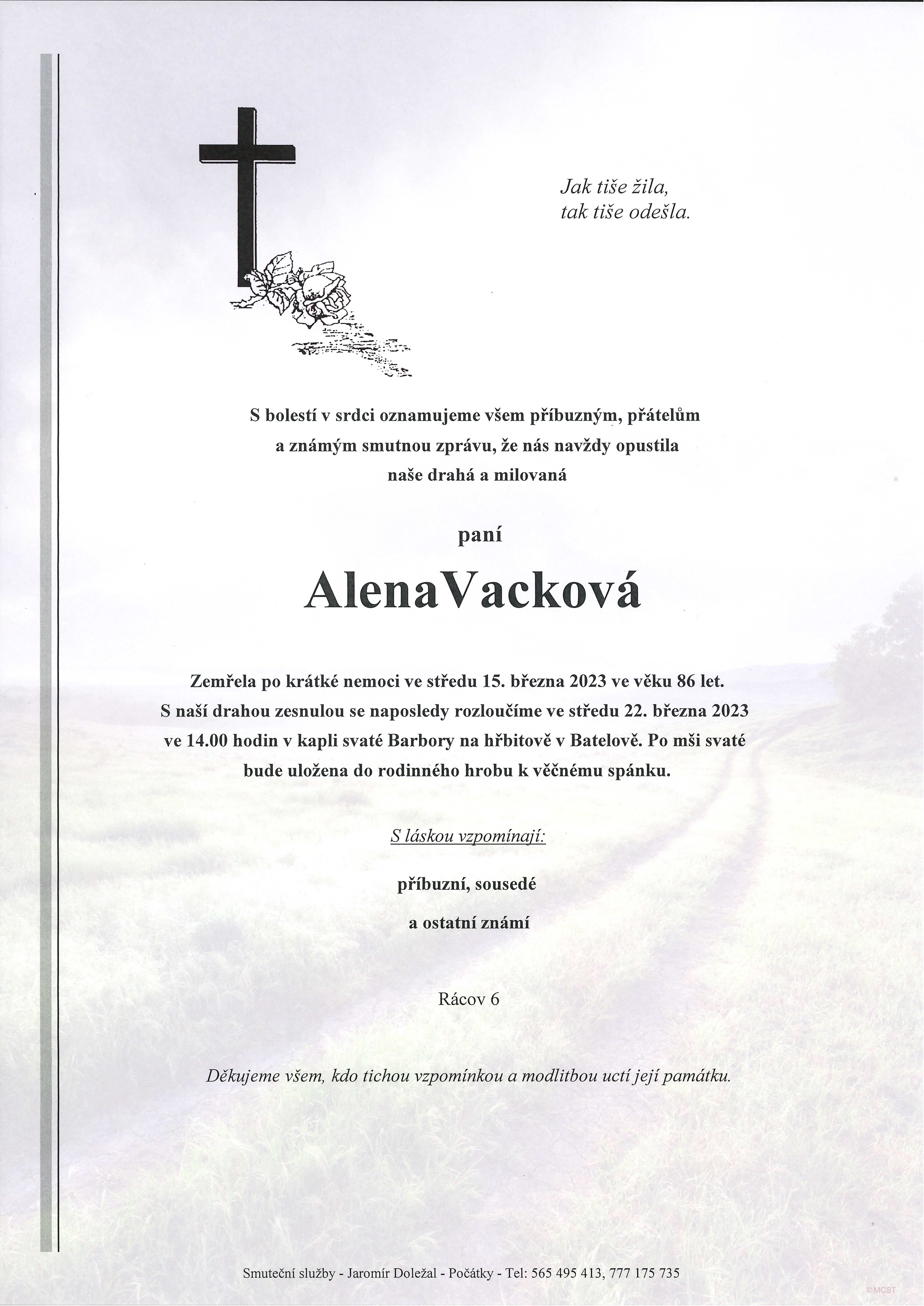 S bolestí v srdci oznamujeme, že nás opustila paní Alena Vacková. Zemřela po krátké nemoci ve středu 15. března 2023 ve věku 86 let. S drahou zesnulou se naposledy rozloučíme ve středu 22. března 2023 ve 14.00 hodin v kapli svaté Barbory na hřbitově v Batelově.