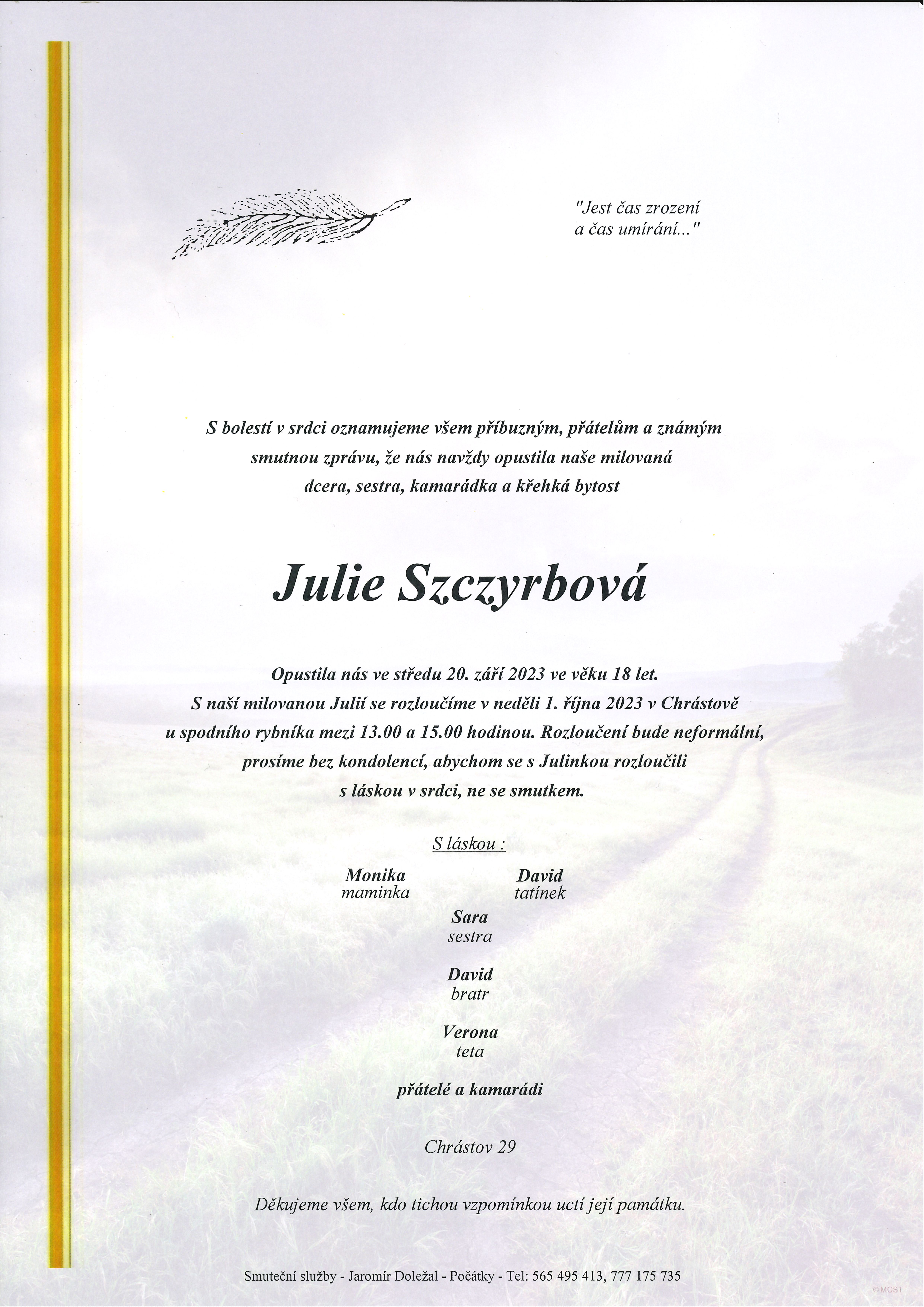 S bolestí v srdci oznamujeme, že nás navždy opustila slečna Julie Szczyrbová. Opustila nás ve středu 20. září 2023 ve věku 18. let. S milovanou Julií se naposledy rozloučíme v neděli 1. října 2023 v Chrástově u spodního rybníka mezi 13.00 a 15.00 hodinou.