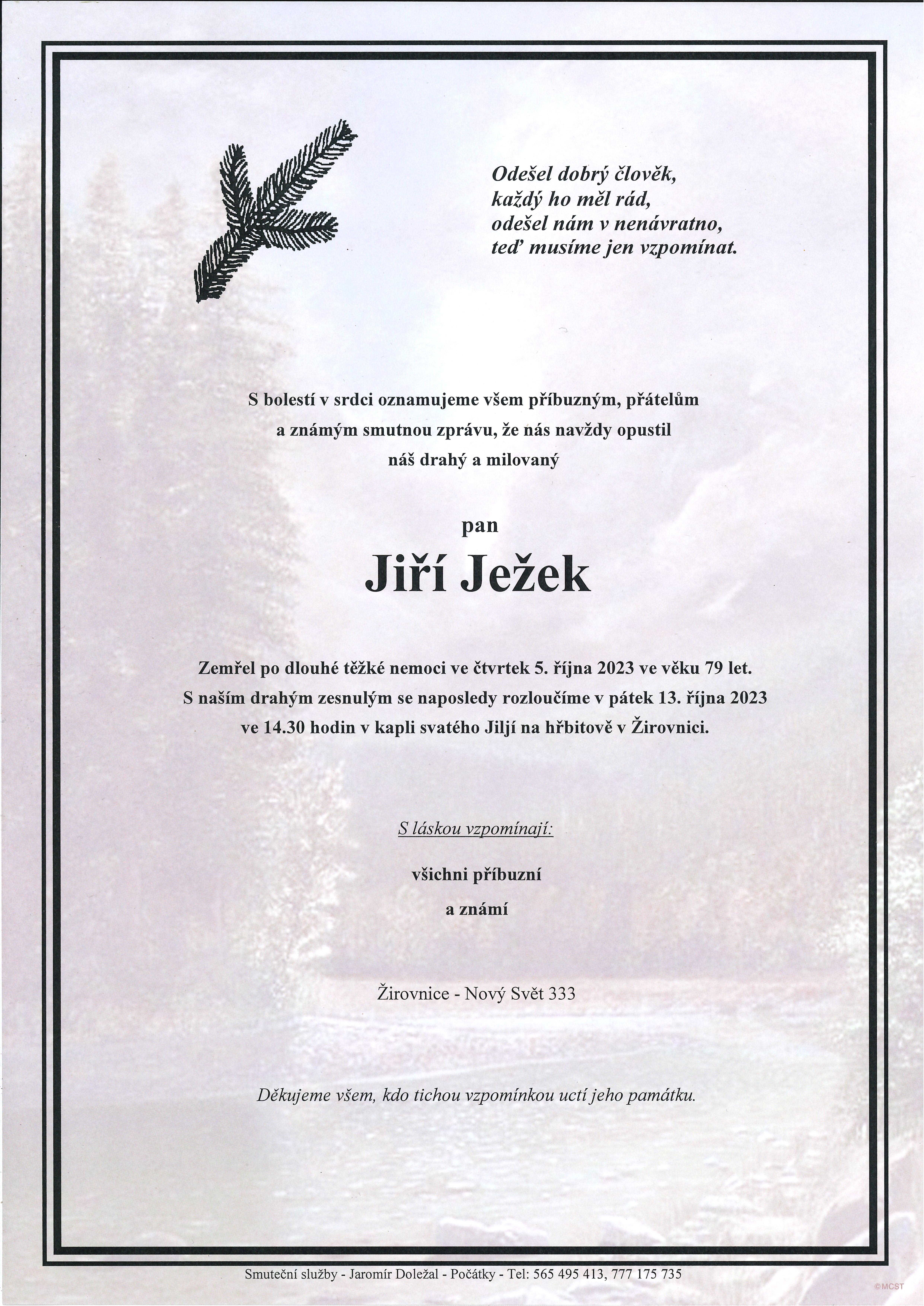 S bolestí v srdci oznamujeme, že nás opustil pan Jiří Ježek. Zemřel po dlouhé těžké nemoci ve čtvrtek  5. října 2023 ve věku 79 let. S drahým zesnulým se naposledy rozloučíme v pátek 13. října 2023 ve 14.30 hodin v kapli svatého Jiljí na hřbitově v Žirovnici.