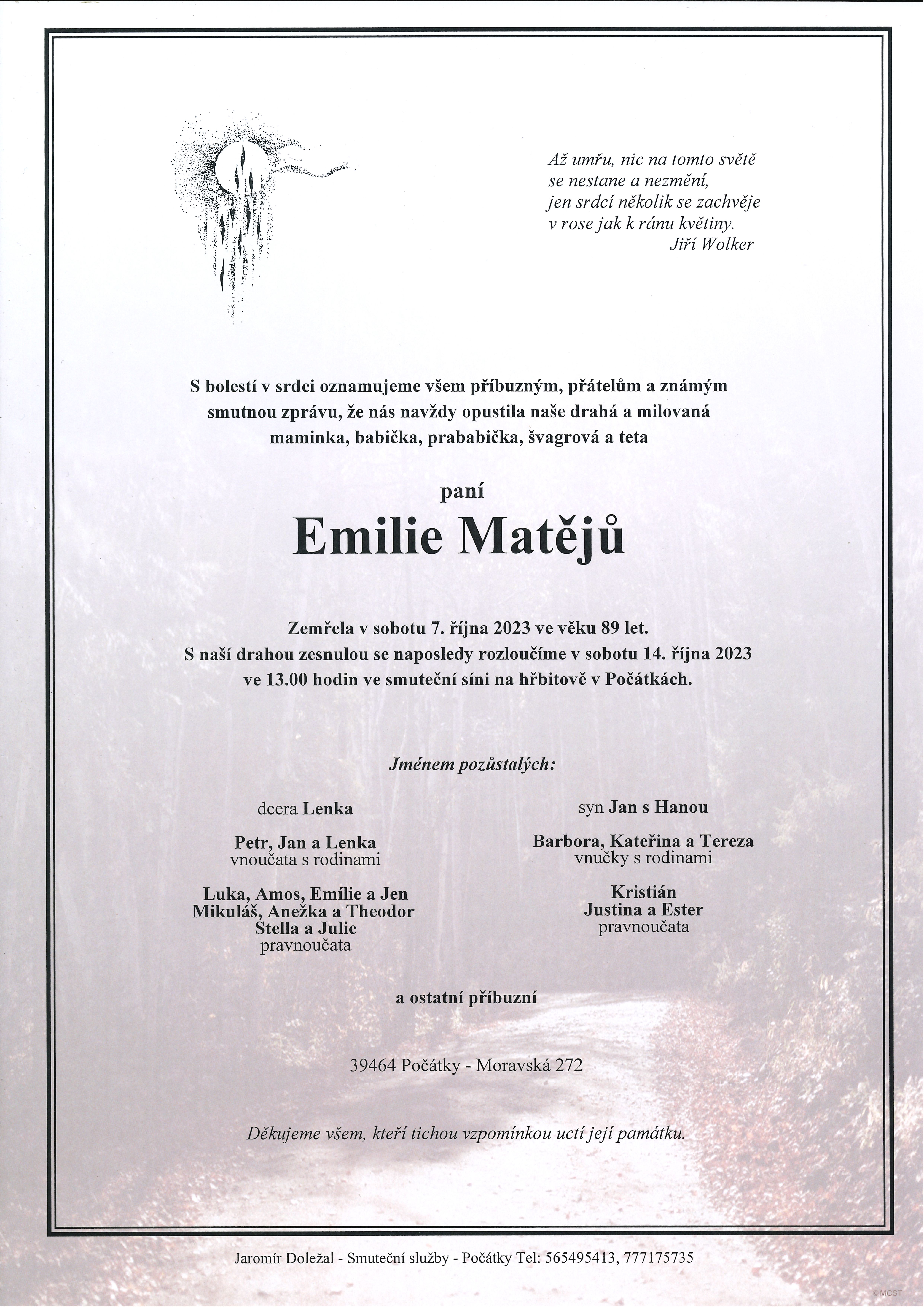 S bolestí v srdci oznamujeme, že nás opustila paní Emilie Matějů. Zemřela v sobotu 7. října 2023 ve věku 89 let. S drahou zesnulou se naposledy rozloučíme v sobotu 14. října 2023 ve 13.00 hodin ve smuteční síni na hřbitově v Počátkách.