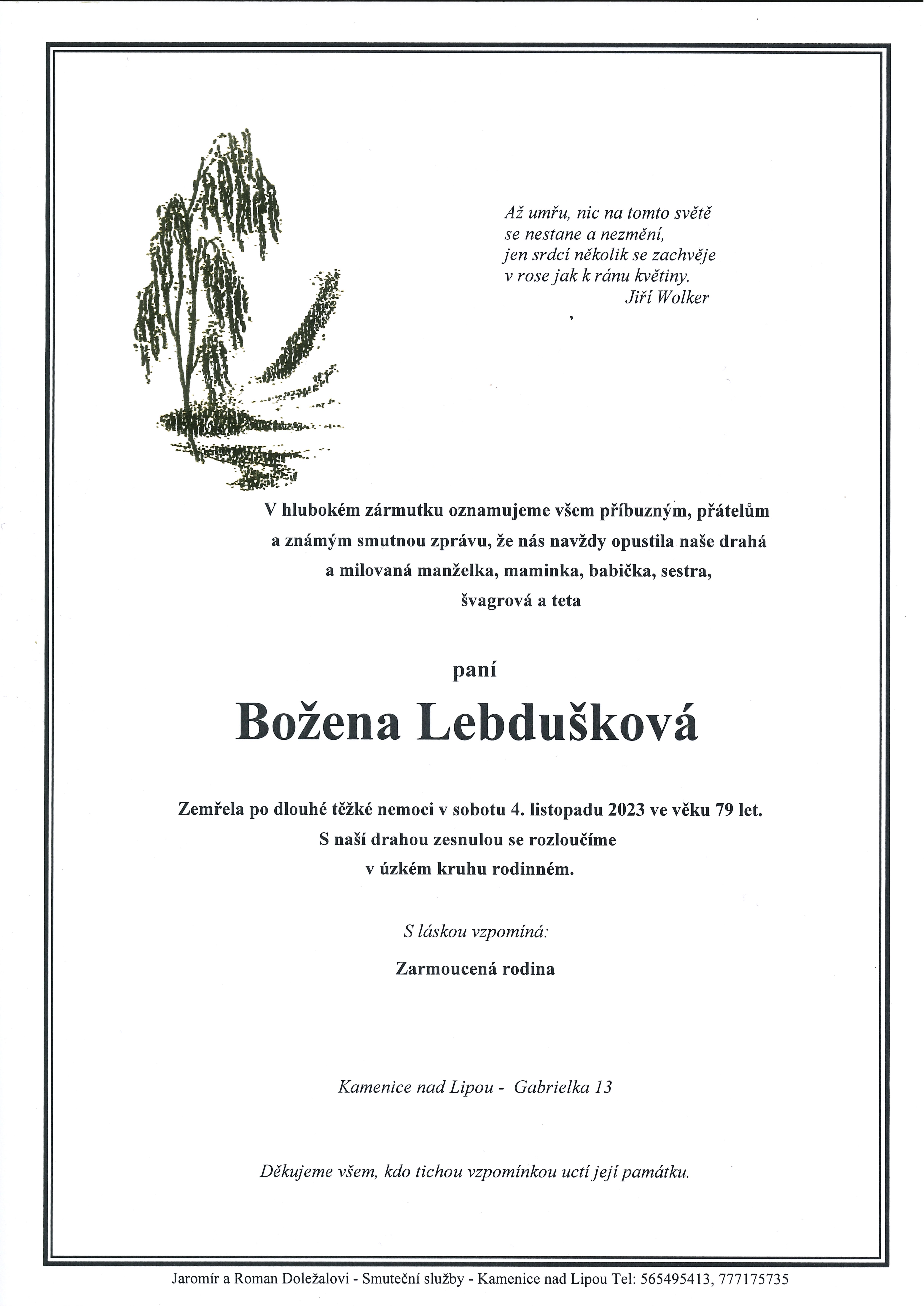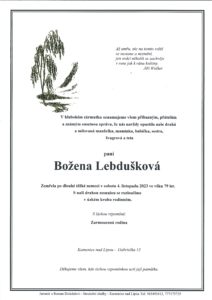 V hlubokém zármutku oznamujeme, že nás opustila paní Božena Lebdušková. Zemřela po dlouhé těžké nemoci v sobotu 4. listopadu 2023 ve věku 79 let. S drahou zesnulou se rozloučíme v úzkém kruhu rodinném.