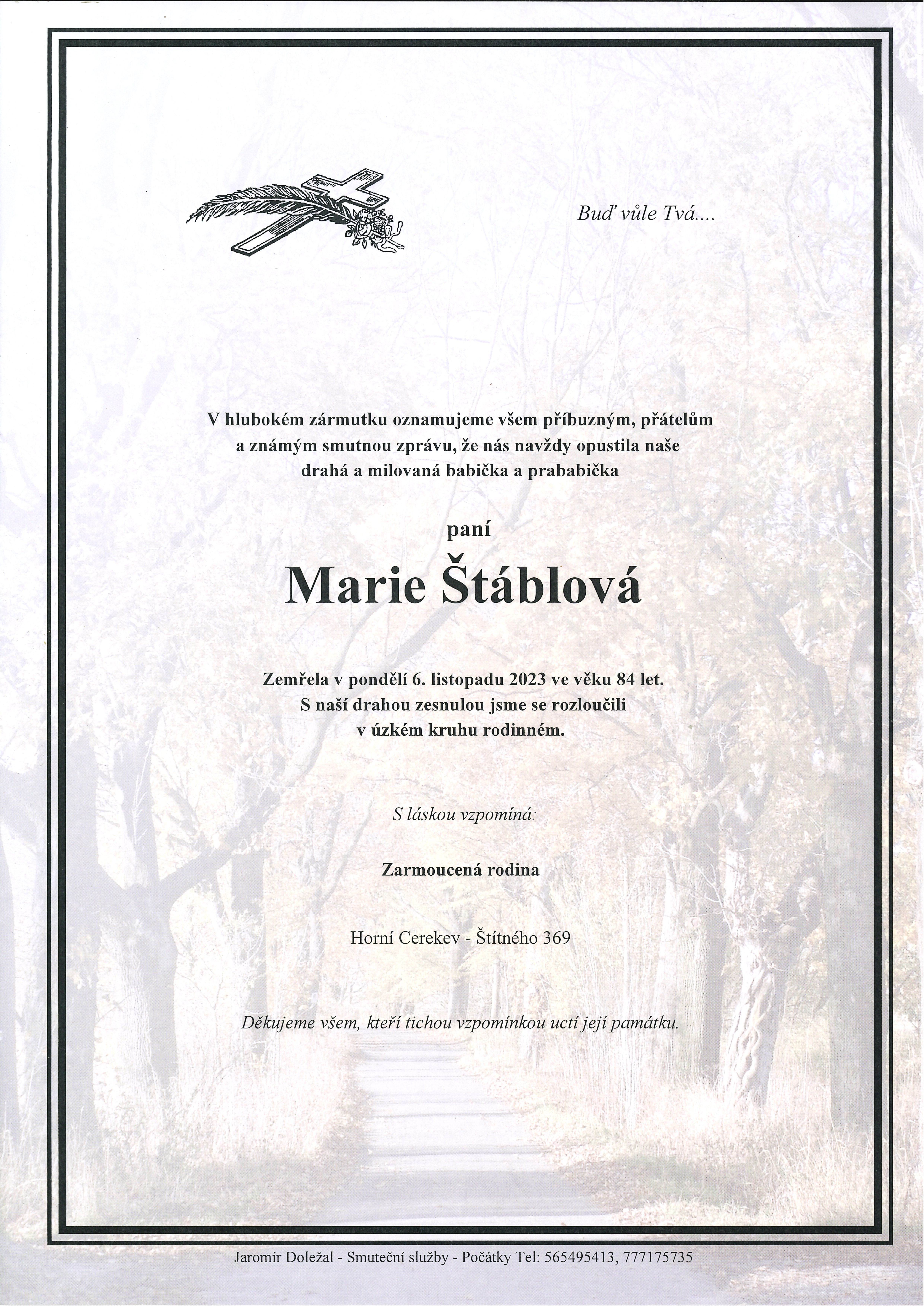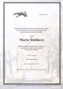 V hlubokém zármutku oznamujeme, že nás navždy opustila paní Marie Štáblová. Zemřela v pondělí 6. listopadu 2023 ve věku 84 let. S drahou zesnulou jsme se rozloučili v úzkém kruhu rodinném.