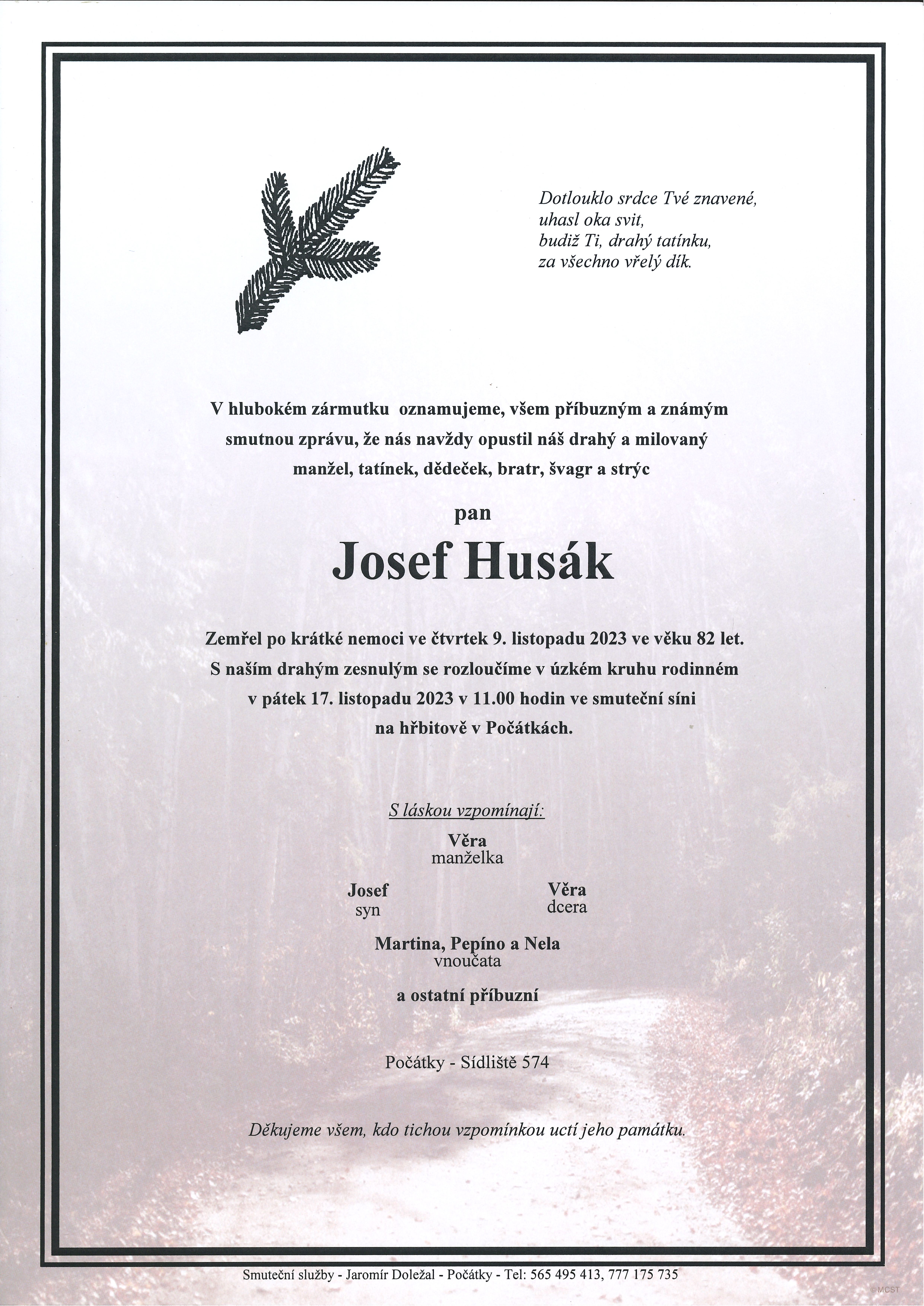 V hlubokém zármutku oznamujeme, že nás opustil pan Josef Husák. Zemřel po krátké nemoci ve čtvrtek 9. listopadu 2023 ve věku 82 let. S drahým zesnulým se rozloučíme v úzkém kruhu rodinném v pátek 17. listopadu 2023 v 11.00 hodin ve smuteční síni na hřbitově v Počátkách.