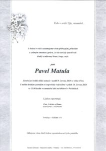 S bolestí v srdci oznamujeme, že nás opustil pan Pavel Matula. Zemřel po krátké těžké nemoci v neděli 9. června 2024 ve věku 65 let. S drahým zesnulým se naposledy rozloučíme v pátek 14. června 2024 ve 13.00 hodin ve smuteční síni na hřbitově v Počátkách.