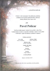 S bolestí v srdci oznamujeme, že nás opustil pan Pavel Policar. Zemřel po krátké nemoci v sobotu 8. června 2024 ve věku 78 let. S drahým zesnulým se naposledy rozloučíme v pátek 14. června 2024 v 10.00 hodin v kapli svaté Barbory na hřbitově v Batelově.