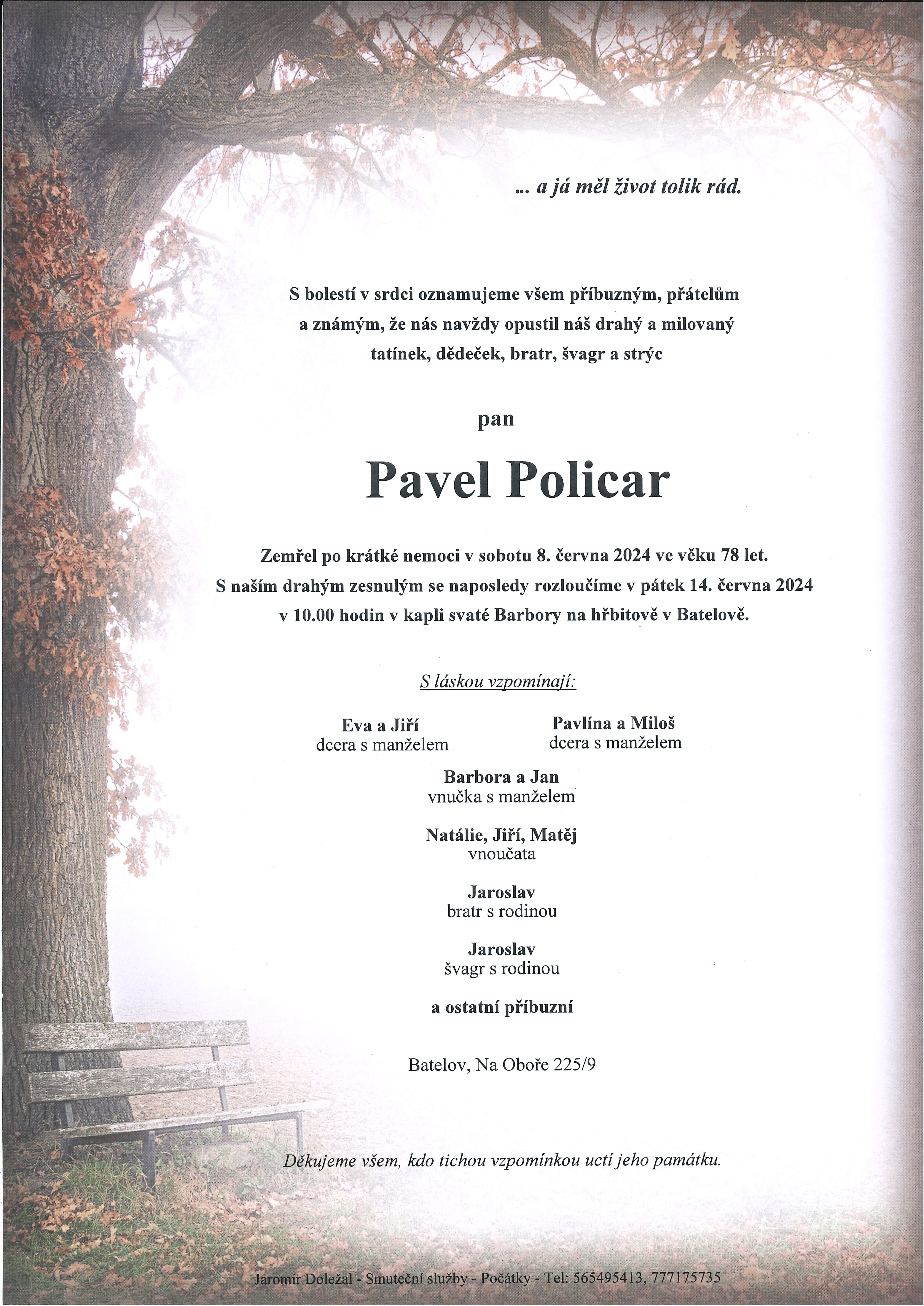 S bolestí v srdci oznamujeme, že nás opustil pan Pavel Policar. Zemřel po krátké nemoci v sobotu 8. června 2024 ve věku 78 let. S drahým zesnulým se naposledy rozloučíme v pátek 14. června 2024 v 10.00 hodin v kapli svaté Barbory na hřbitově v Batelově.