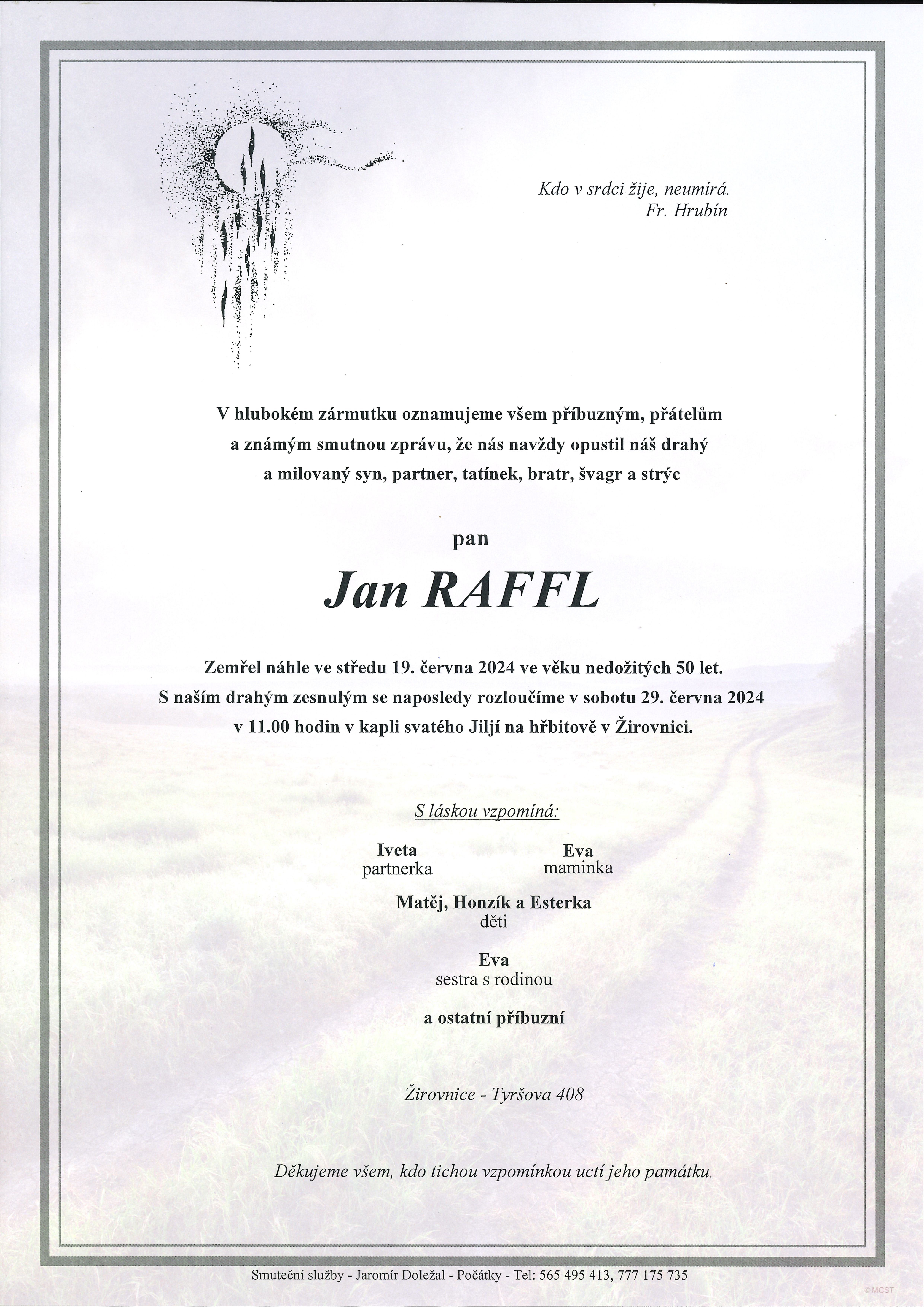 V hlubokém zármutku oznamujeme, že nás opustil pan Jan Raffl. Zemřel náhle ve středu 19. června 2024 ve věku nedožitých 50 let. S drahým zesnulým se naposledy rozloučíme v sobotu 29. června 2024 v 11.00 hodin v kapli svatého Jiljí na hřbitově v Žirovnici.