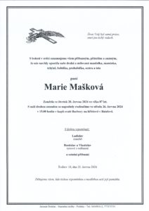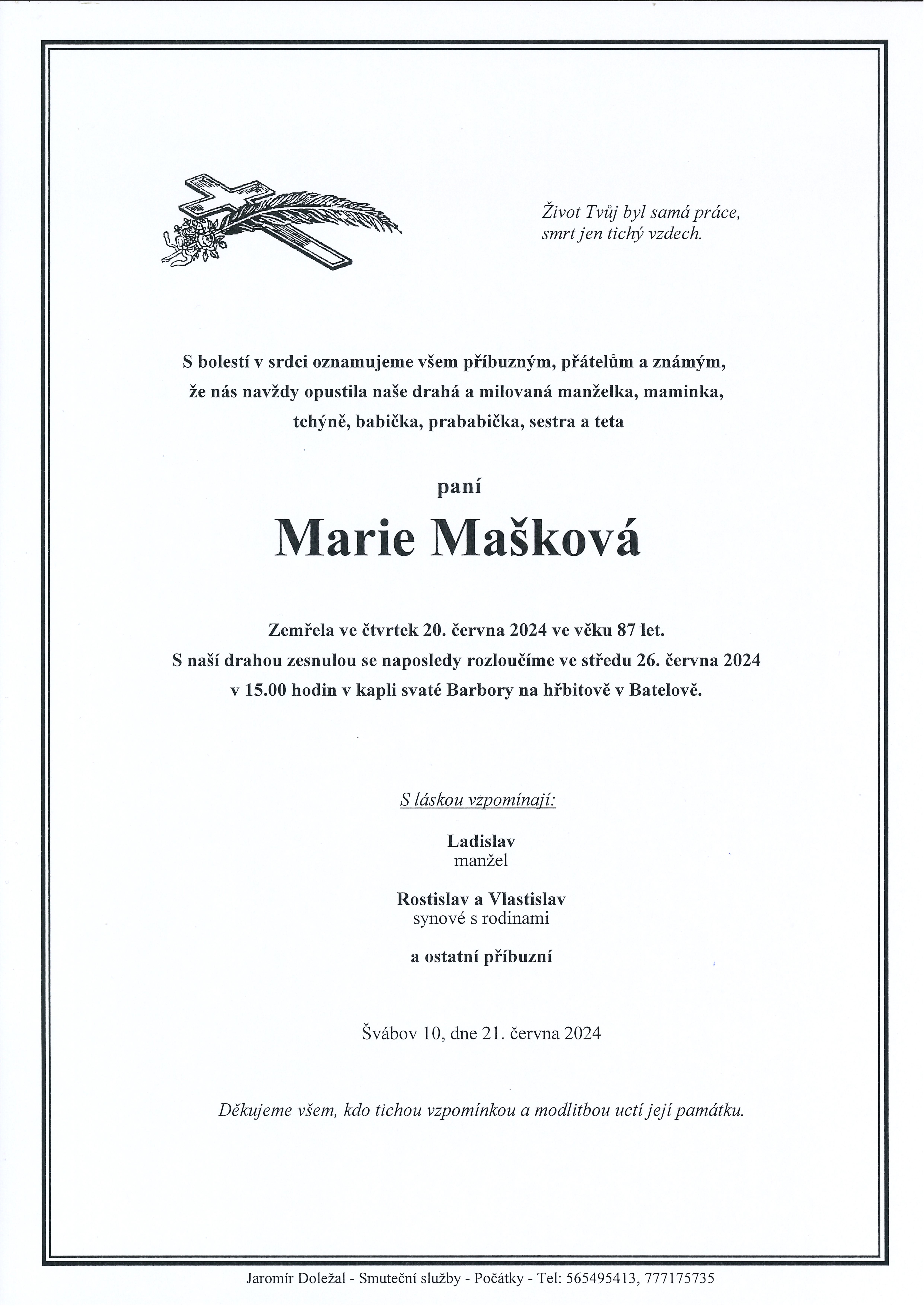 S bolestí v srdci oznamujeme, že nás opustila paní Marie Mašková. Zemřela ve čtvrtek 20. června 2024 ve věku 87 let. S drahou zesnulou se naposledy rozloučíme ve středu 26. června 2024 v 15.00 hodin v kapli svaté Barbory na hřbitově v Batelově.