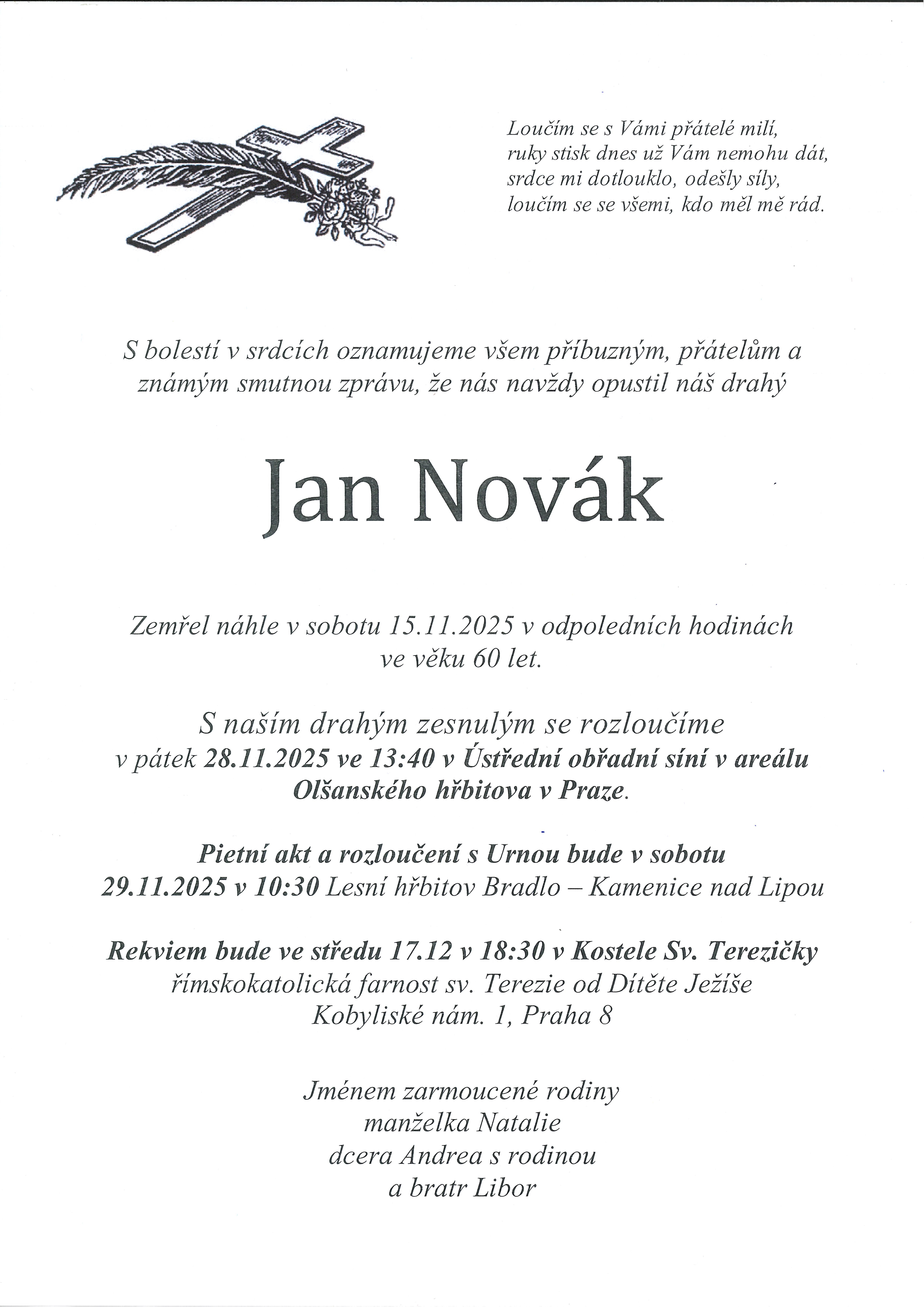 Pietní akt a rozloučení s Urnou, bude v sobotu 29. listopadu 2025 v 10.30 hodin – Lesní hřbitov Bradlo – Kamenice nad Lipou.