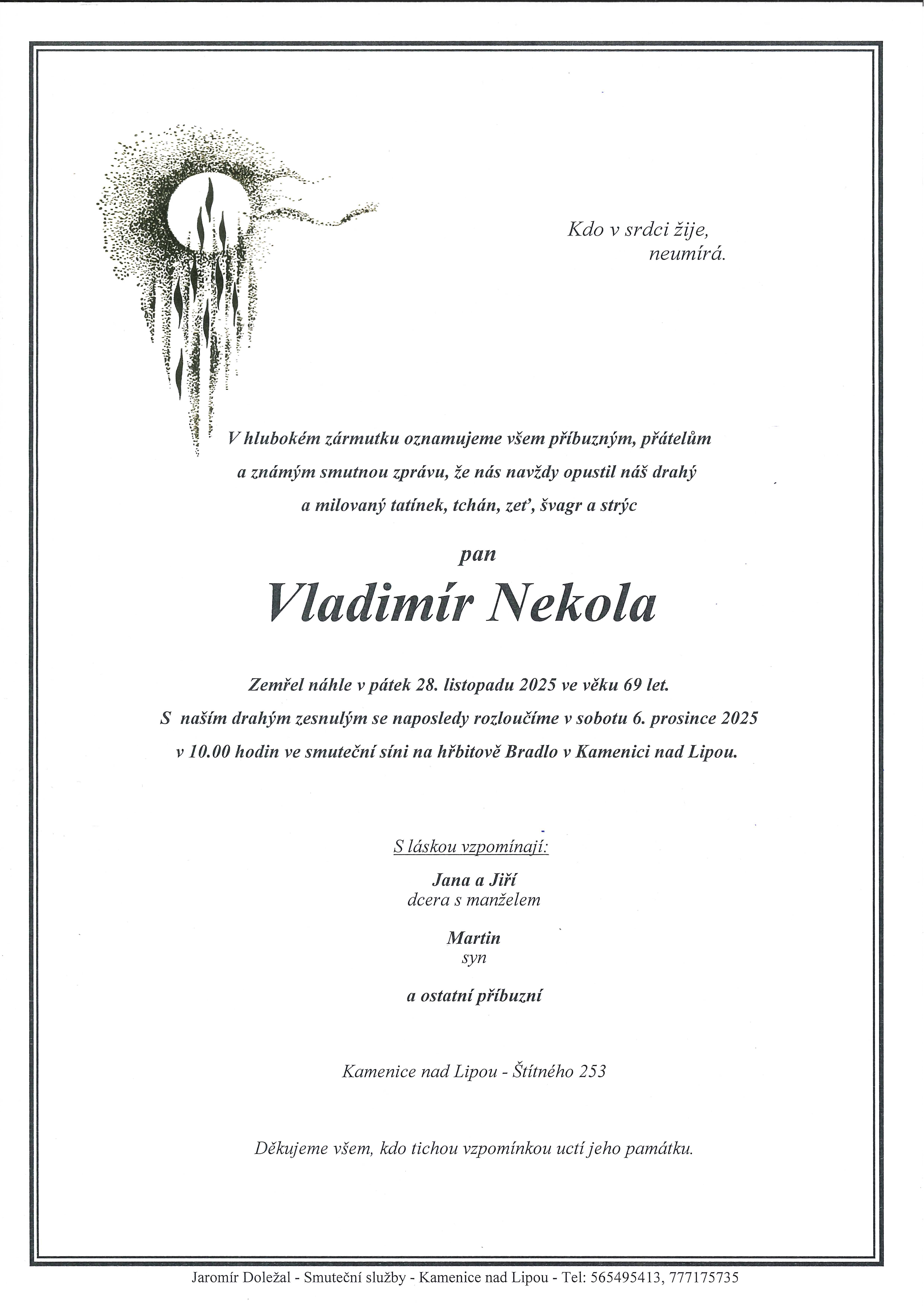 V hlubokém zármutku oznamujeme, že nás opustil pan Vladimír Nekola. Zemřel náhle v pátek 28. listopadu 2025 ve věku 69 let. S drahým zesnulým se naposledy rozloučíme v sobotu 6. prosince 2025 v 10.00 hodin ve smuteční síni na hřbitově Bradlo v Kamenici nad Lipou.